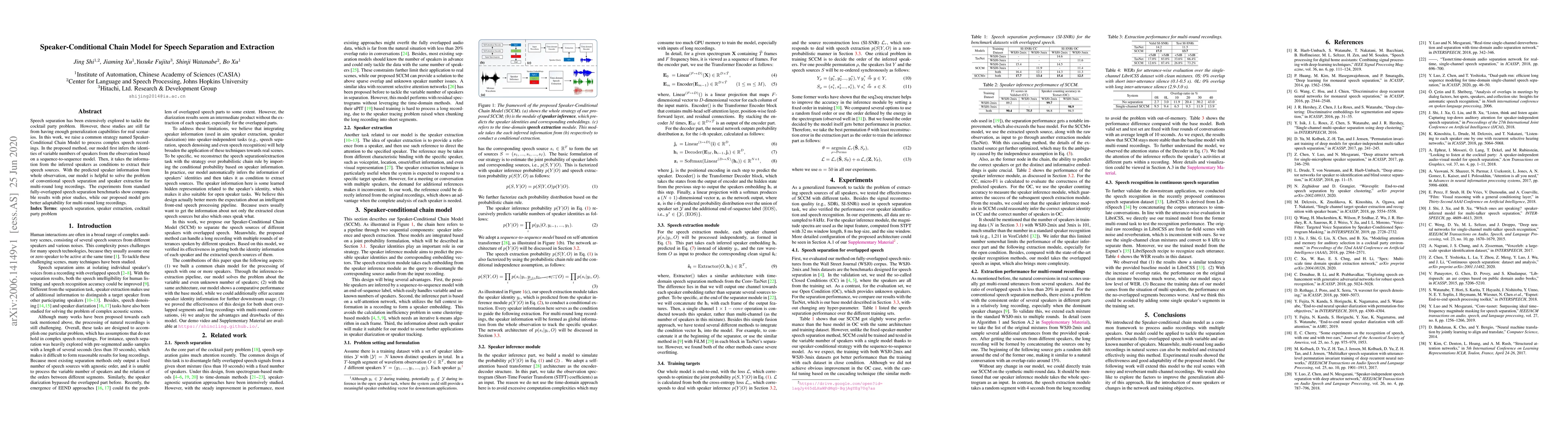 A new model called Speaker-Conditional Chain Model improves speech separation and extraction in complex recordings by first identifying speaker identities and then using that information to extract their sources. The results show comparable performance with existing methods but better adaptability for long recordings.