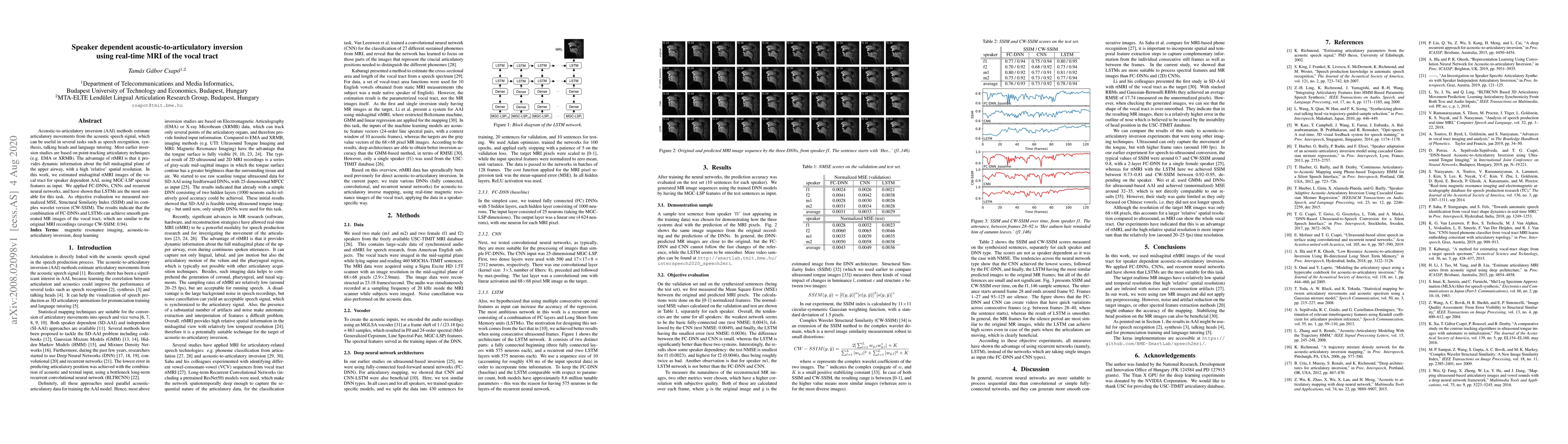 This study uses midsagittal real-time MRI images of the vocal tract for speaker-dependent acoustic-to-articulatory inversion, applying FC-DNNs, CNNs, and recurrent neural networks (LSTMs). The data is sourced from the USC-TIMIT MRIdatabase, with synchronized audio and real-time MRI for speech research from American English subjects.