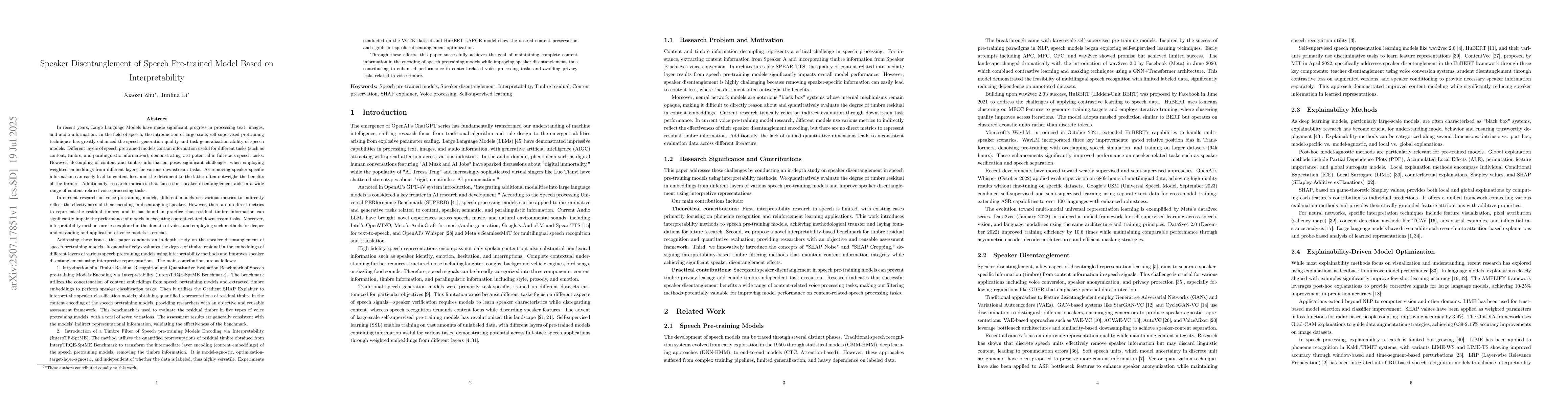 Speech pretrained models contain task-specific information across different layers, but decoupling content and timbre information remains challenging as removing speaker-specific information often causes content loss. Current research lacks direct metrics to quantify timbre residual in model encodings, relying on indirect evaluation through downstream tasks. This paper addresses these challenges through interpretability-based speaker disentanglement in speech pretraining models. We quantitatively evaluate timbre residual in model embeddings and improve speaker disentanglement using interpretive representations. Our contributions include: (1) InterpTRQE-SptME Benchmark - a timbre residual recognition framework using interpretability. The benchmark concatenates content embeddings with timbre embeddings for speaker classification, then applies Gradient SHAP Explainer to quantify timbre residual. We evaluate seven speech pretraining model variations. (2) InterpTF-SptME method - an interpretability-based timbre filtering approach using SHAP Noise and SHAP Cropping techniques. This model-agnostic method transforms intermediate encodings to remove timbre while preserving content. Experiments on VCTK dataset with HuBERT LARGE demonstrate successful content preservation and significant speaker disentanglement optimization. Results show the SHAP Noise method can reduce timbre residual from 18.05% to near 0% while maintaining content integrity, contributing to enhanced performance in content-related speech processing tasks and preventing timbre privacy leakage.