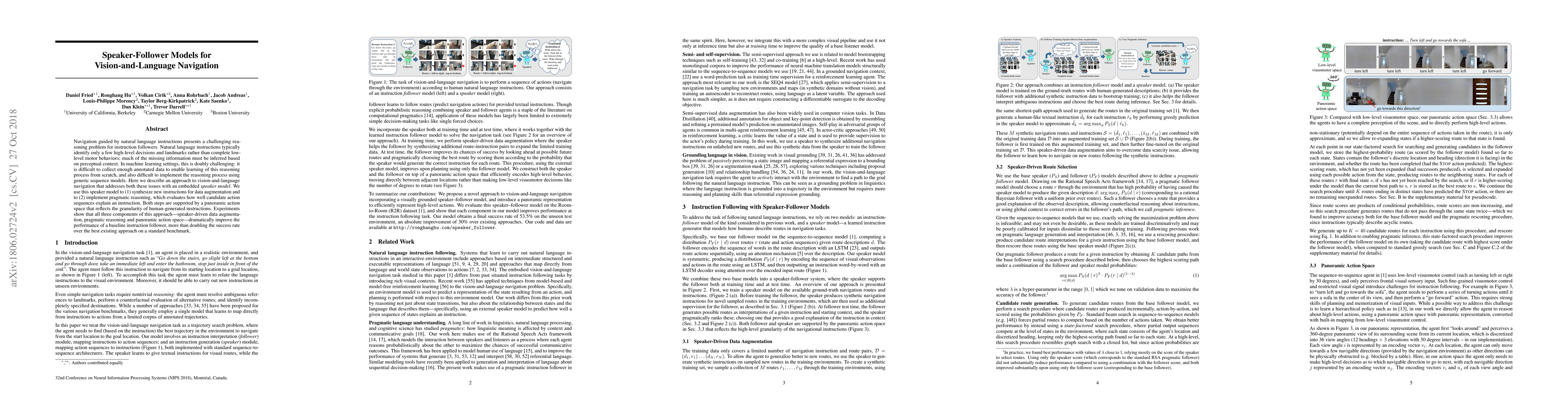 Navigation guided by natural language instructions presents a challenging reasoning problem for instruction followers. Natural language instructions typically identify only a few high-level decisions and landmarks rather than complete low-level motor behaviors; much of the missing information must be inferred based on perceptual context. In machine learning settings, this is doubly challenging: it is difficult to collect enough annotated data to enable learning of this reasoning process from scratch, and also difficult to implement the reasoning process using generic sequence models. Here we describe an approach to vision-and-language navigation that addresses both these issues with an embedded speaker model. We use this speaker model to (1) synthesize new instructions for data augmentation and to (2) implement pragmatic reasoning, which evaluates how well candidate action sequences explain an instruction. Both steps are supported by a panoramic action space that reflects the granularity of human-generated instructions. Experiments show that all three components of this approach---speaker-driven data augmentation, pragmatic reasoning and panoramic action space---dramatically improve the performance of a baseline instruction follower, more than doubling the success rate over the best existing approach on a standard benchmark.