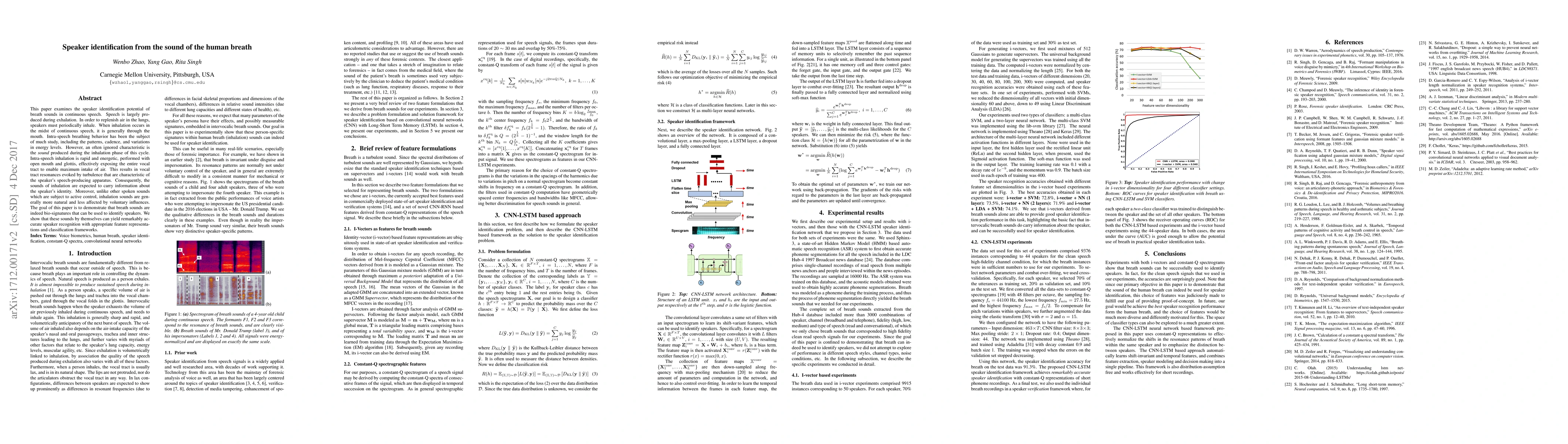 This paper examines the speaker identification potential of breath sounds in continuous speech. Speech is largely produced during exhalation. In order to replenish air in the lungs, speakers must periodically inhale. When inhalation occurs in the midst of continuous speech, it is generally through the mouth. Intra-speech breathing behavior has been the subject of much study, including the patterns, cadence, and variations in energy levels. However, an often ignored characteristic is the {\em sound} produced during the inhalation phase of this cycle. Intra-speech inhalation is rapid and energetic, performed with open mouth and glottis, effectively exposing the entire vocal tract to enable maximum intake of air. This results in vocal tract resonances evoked by turbulence that are characteristic of the speaker's speech-producing apparatus. Consequently, the sounds of inhalation are expected to carry information about the speaker's identity. Moreover, unlike other spoken sounds which are subject to active control, inhalation sounds are generally more natural and less affected by voluntary influences. The goal of this paper is to demonstrate that breath sounds are indeed bio-signatures that can be used to identify speakers. We show that these sounds by themselves can yield remarkably accurate speaker recognition with appropriate feature representations and classification frameworks.