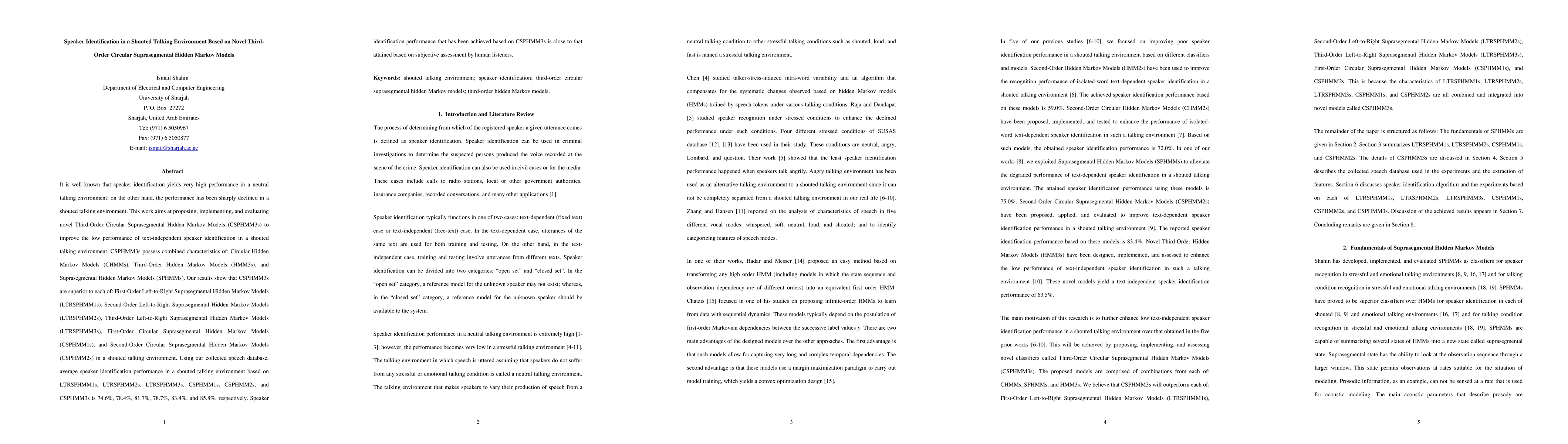 This paper proposes novel Third-Order Circular Suprasegmental Hidden Markov Models (CSPHMM3s) to enhance speaker identification in shouted talking environments. CSPHMM3s outperform existing models, achieving an 85.8% identification rate, significantly higher than other models tested.