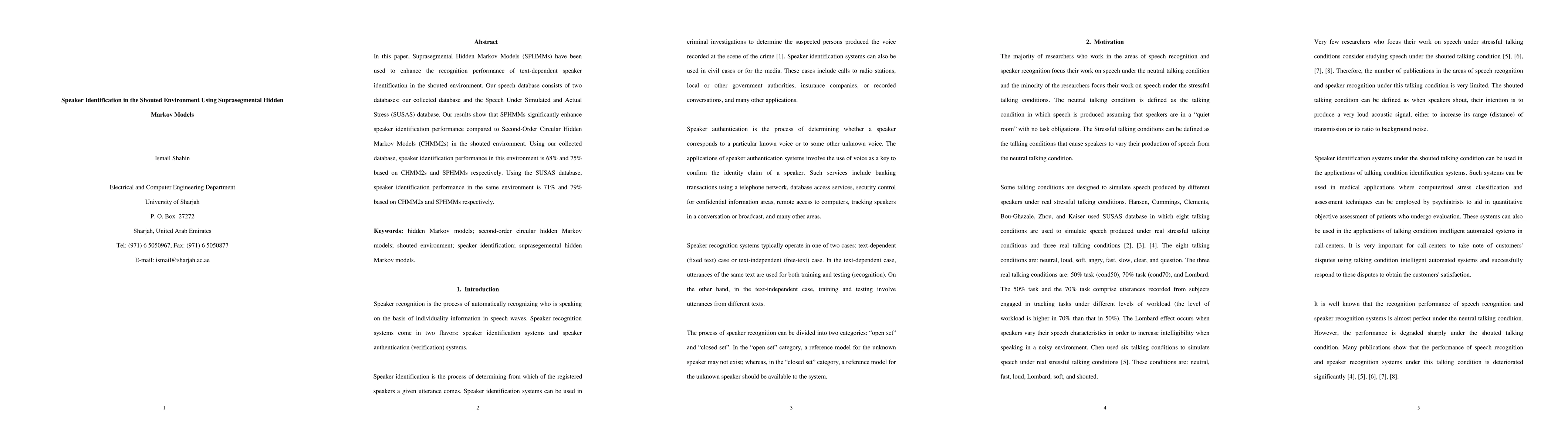 This research employs Suprasegmental Hidden Markov Models (SPHMMs) to enhance speaker identification in shouted environments, comparing their performance with Second-Order Circular Hidden Markov Models (CHMM2s) using two speech databases: a collected database and the Speech Under Simulated and Actual Stress (SUSAS) database.