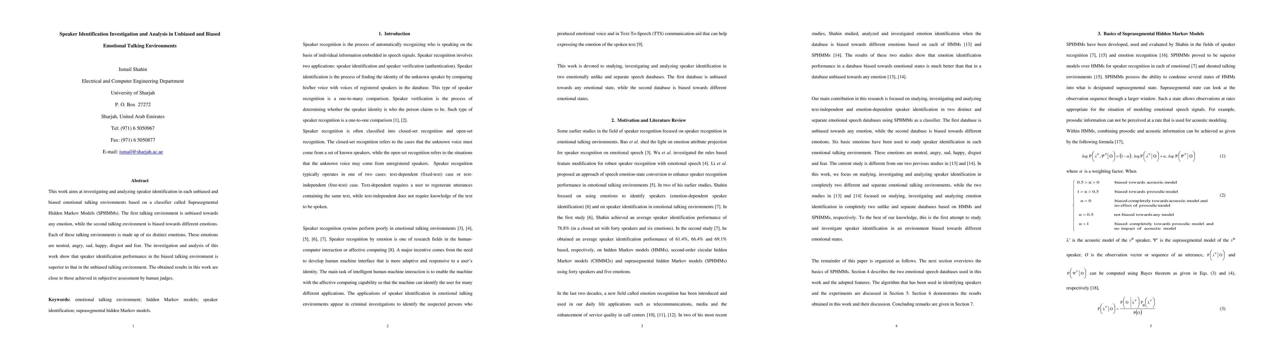 This work aims at investigating and analyzing speaker identification in each unbiased and biased emotional talking environments based on a classifier called Suprasegmental Hidden Markov Models (SPHMMs). The first talking environment is unbiased towards any emotion, while the second talking environment is biased towards different emotions. Each of these talking environments is made up of six distinct emotions. These emotions are neutral, angry, sad, happy, disgust and fear. The investigation and analysis of this work show that speaker identification performance in the biased talking environment is superior to that in the unbiased talking environment. The obtained results in this work are close to those achieved in subjective assessment by human judges.