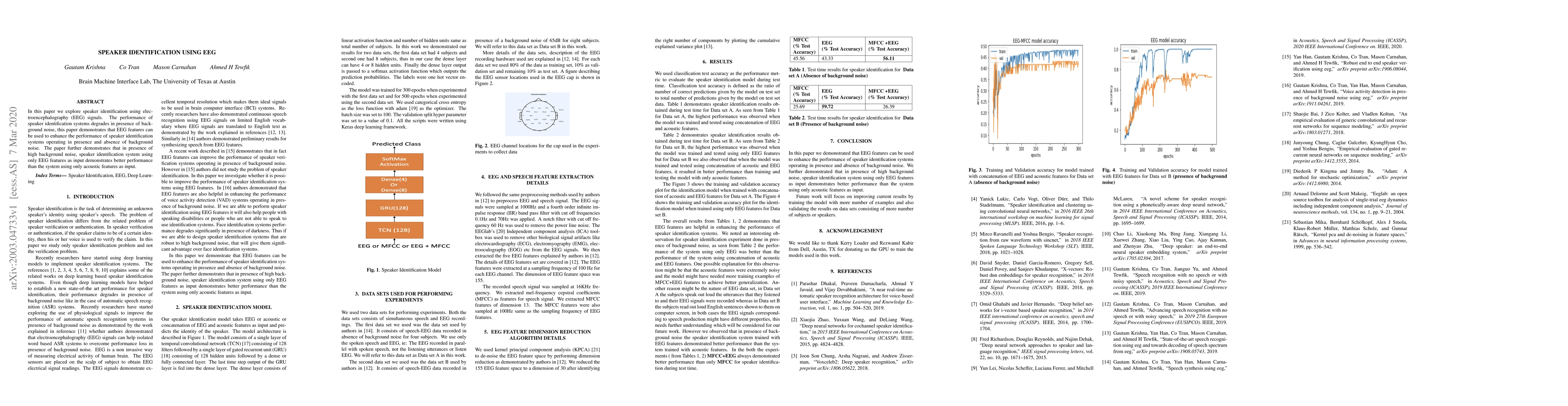 The paper explores speaker identification using EEG signals, demonstrating that EEG features can enhance the performance of speaker identification systems in the presence and absence of background noise. The study uses two datasets: Dataset A (4 subjects, no background noise) and Dataset B (8 subjects, 65 dB background noise). EEG and speech signals are preprocessed, features are extracted (5 EEG features and MFCC for speech), and dimensionality is reduced using Kernel PCA. The model is trained using Keras and evaluated with classification test accuracy.
