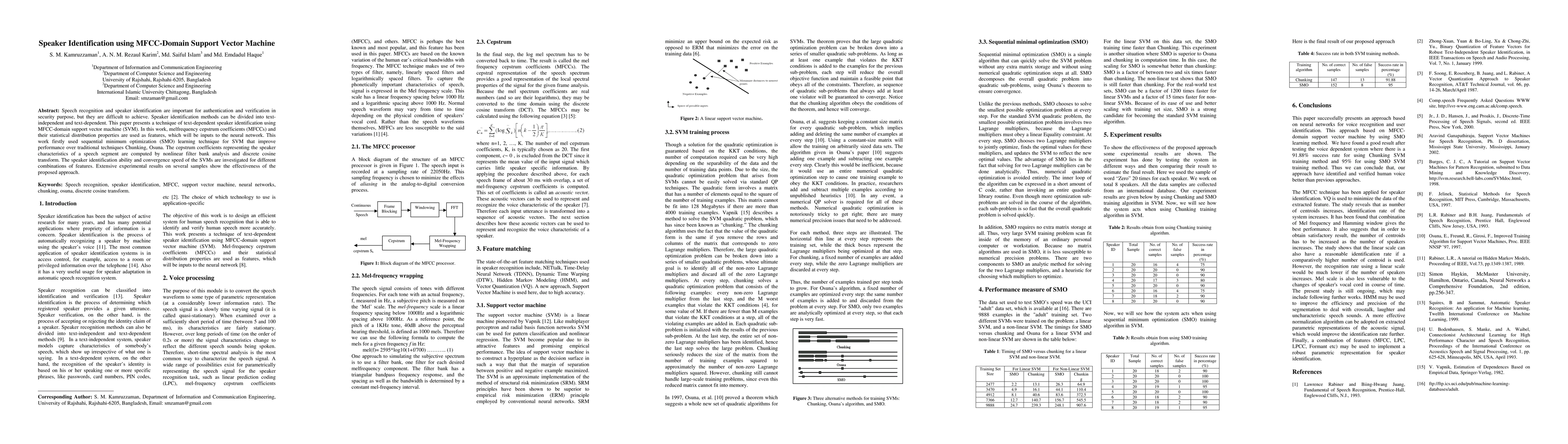 This paper proposes a text-dependent speaker identification method using MFCC features and an MFCC-domain SVM with SMO learning, demonstrating improved performance over traditional techniques. Experimental results confirm the effectiveness of the approach.