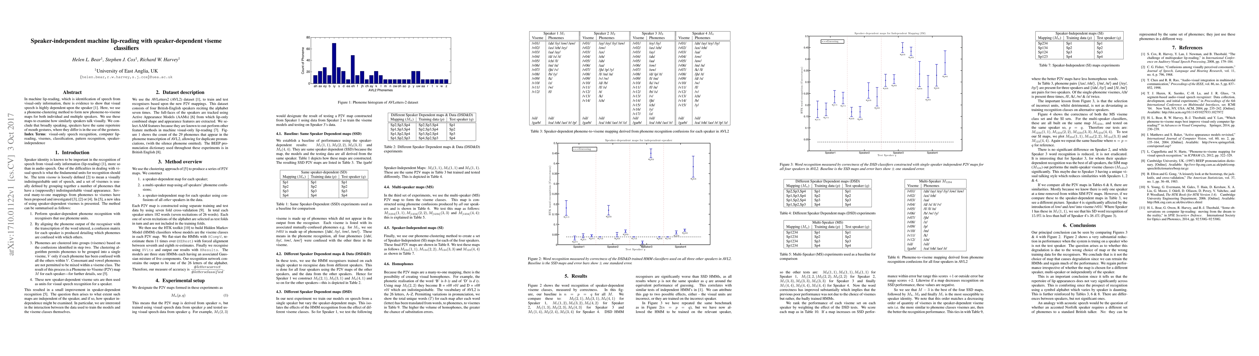 This paper explores speaker-independent machine lip-reading by developing speaker-dependent viseme classifiers. It finds that while visual speech varies by speaker, all speakers share a common set of mouth gestures, differing mainly in their usage.