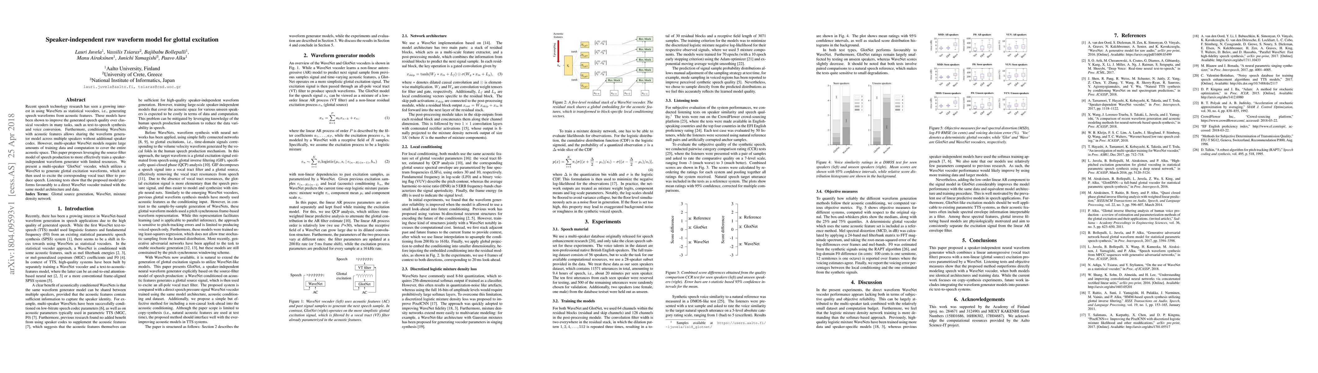 This paper introduces a speaker-independent vocoder called GlotNet, which uses WaveNets to generate glottal excitation waveforms that excite a vocal tract filter to produce speech. The model shows favorable performance compared to a direct WaveNet vocoder, demonstrating effective training with limited resources.