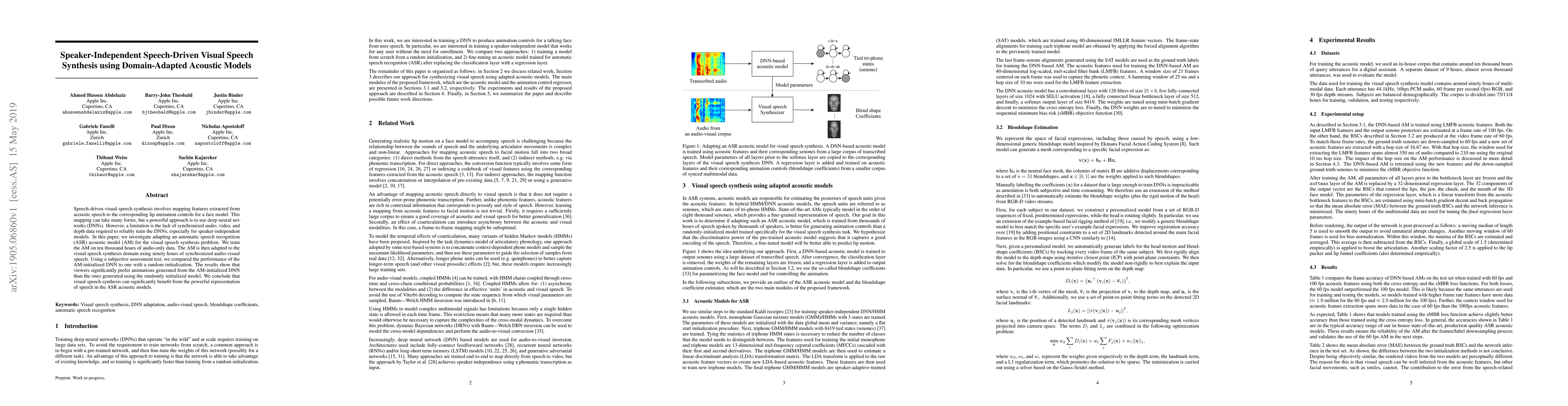 This paper explores speaker-independent visual speech synthesis by adapting an automatic speech recognition acoustic model to the visual domain. Results from a subjective assessment show that DNNs initialized with the adapted acoustic model produce significantly more preferred lip animations compared to those with random initialization.
