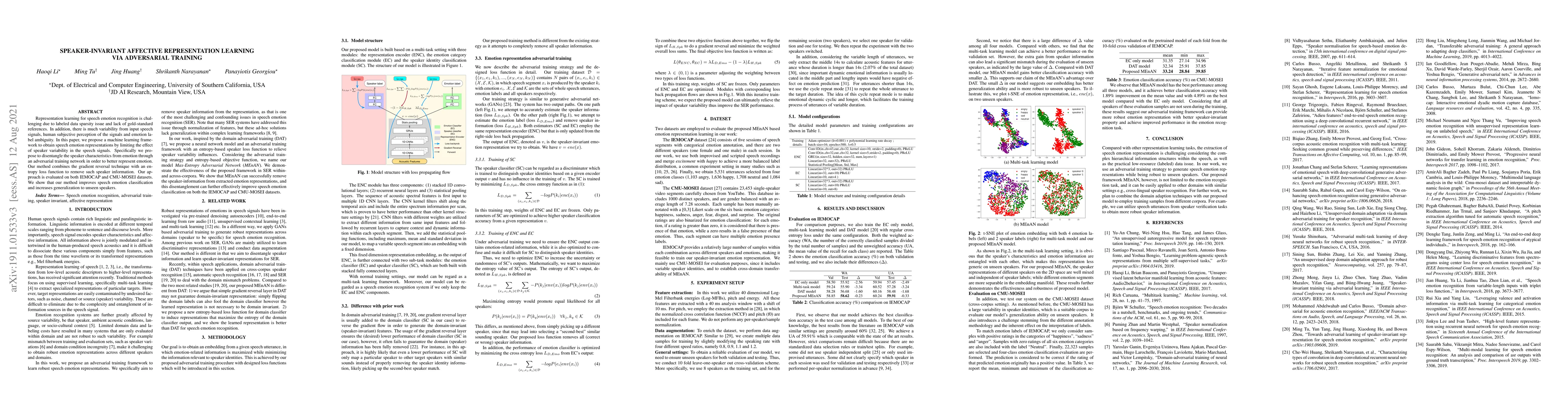 This paper proposes a machine learning framework for speech emotion recognition that disentangles speaker characteristics from emotion using adversarial training. The method combines gradient reversal with entropy loss to reduce speaker variability, improving classification and generalization on IEMOCAP and CMU-MOSEI datasets.