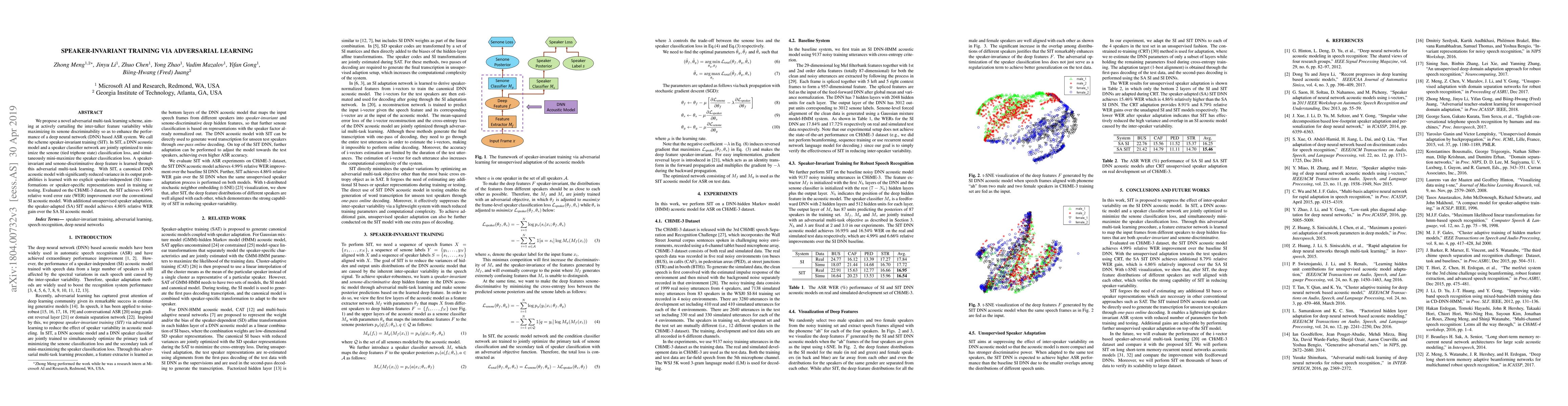 This paper introduces speaker-invariant training (SIT) using adversarial multi-task learning to reduce inter-talker variability and enhance ASR performance. SIT jointly optimizes a DNN acoustic model and a speaker classifier, achieving a 4.99% relative WER improvement over conventional SI models. With unsupervised speaker adaptation, SIT further improves WER by 4.86%.