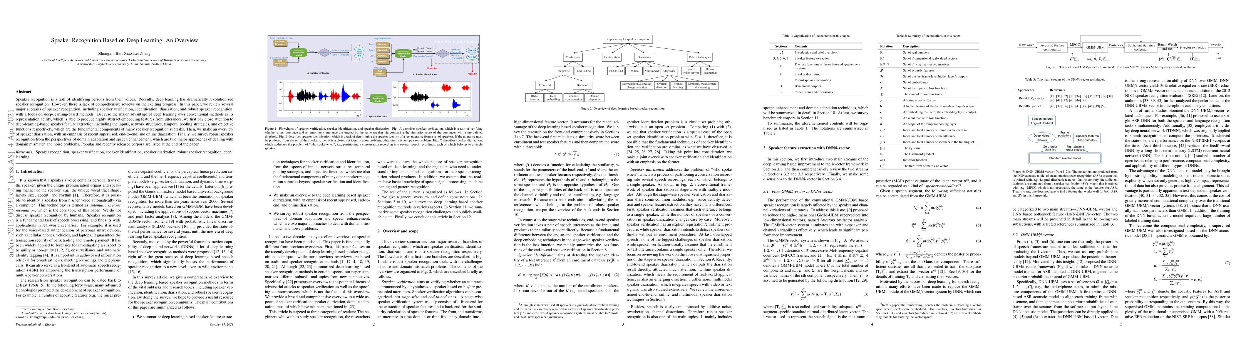 This paper provides a comprehensive review of deep learning-based methods in speaker recognition, focusing on feature extraction, speaker verification, identification, diarization, and robust recognition techniques. It highlights the advantages of deep learning in producing abstract embeddings and discusses recent advancements in these subtasks.