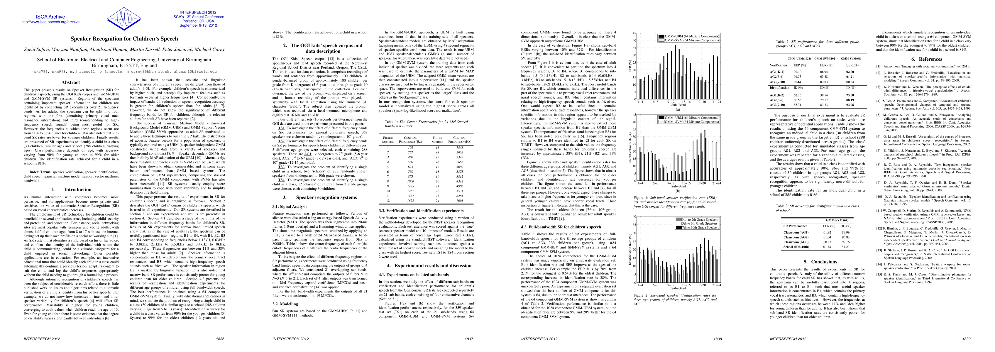 This paper investigates Speaker Recognition for children's speech using the OGI Kids corpus, identifying that the most informative frequency bands for children are 11% to 38% higher than those for adults. Class identification accuracy ranges from 90% for young children to 99% for older children, while school-wide identification achieves 81%.