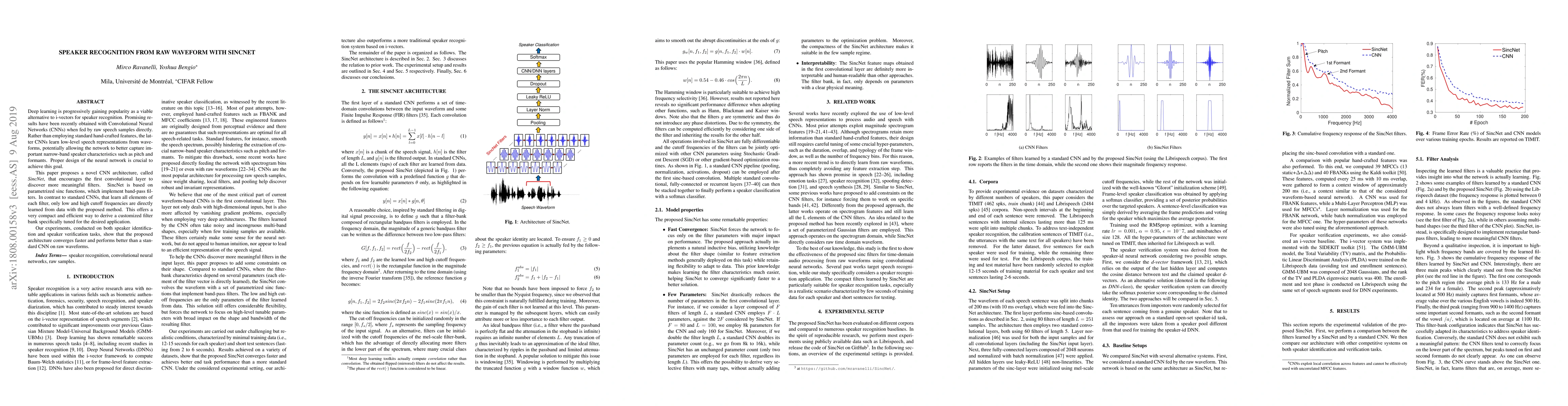 This paper introduces SincNet, a novel CNN architecture for speaker recognition using raw waveforms, which employs parametrized sinc functions to create band-pass filters, leading to faster convergence and better performance compared to standard CNNs. Experiments demonstrate superior results in both speaker identification and verification tasks.