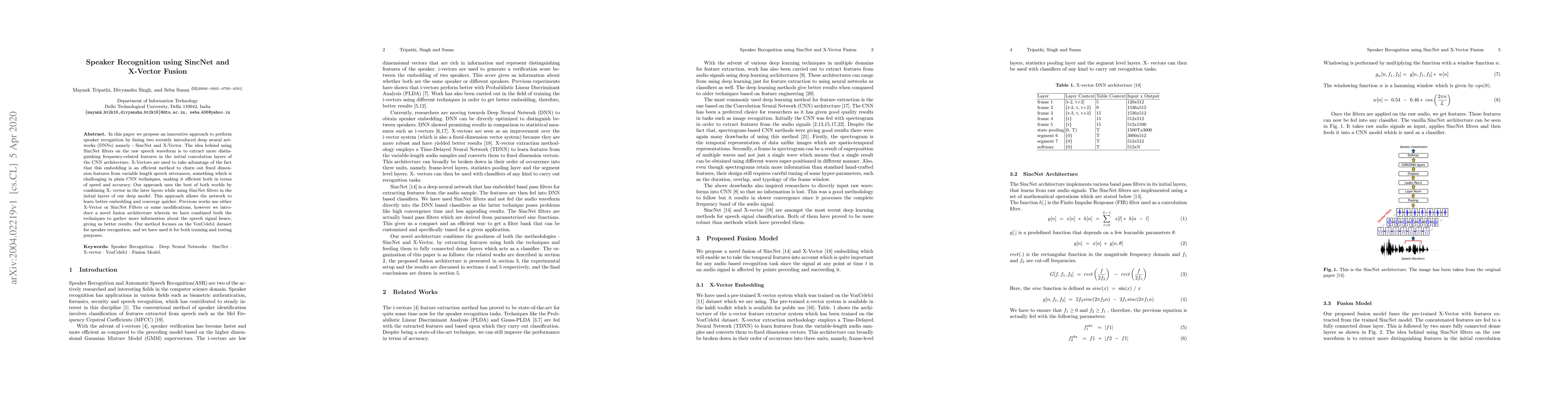 In this paper, we propose an innovative approach to perform speaker recognition by fusing two recently introduced deep neural networks (DNNs) namely - SincNet and X-Vector. The idea behind using SincNet filters on the raw speech waveform is to extract more distinguishing frequency-related features in the initial convolution layers of the CNN architecture. X-Vectors are used to take advantage of the fact that this embedding is an efficient method to churn out fixed dimension features from variable length speech utterances, something which is challenging in plain CNN techniques, making it efficient both in terms of speed and accuracy. Our approach uses the best of both worlds by combining X-vector in the later layers while using SincNet filters in the initial layers of our deep model. This approach allows the network to learn better embedding and converge quicker. Previous works use either X-Vector or SincNet Filters or some modifications, however we introduce a novel fusion architecture wherein we have combined both the techniques to gather more information about the speech signal hence, giving us better results. Our method focuses on the VoxCeleb1 dataset for speaker recognition, and we have used it for both training and testing purposes.