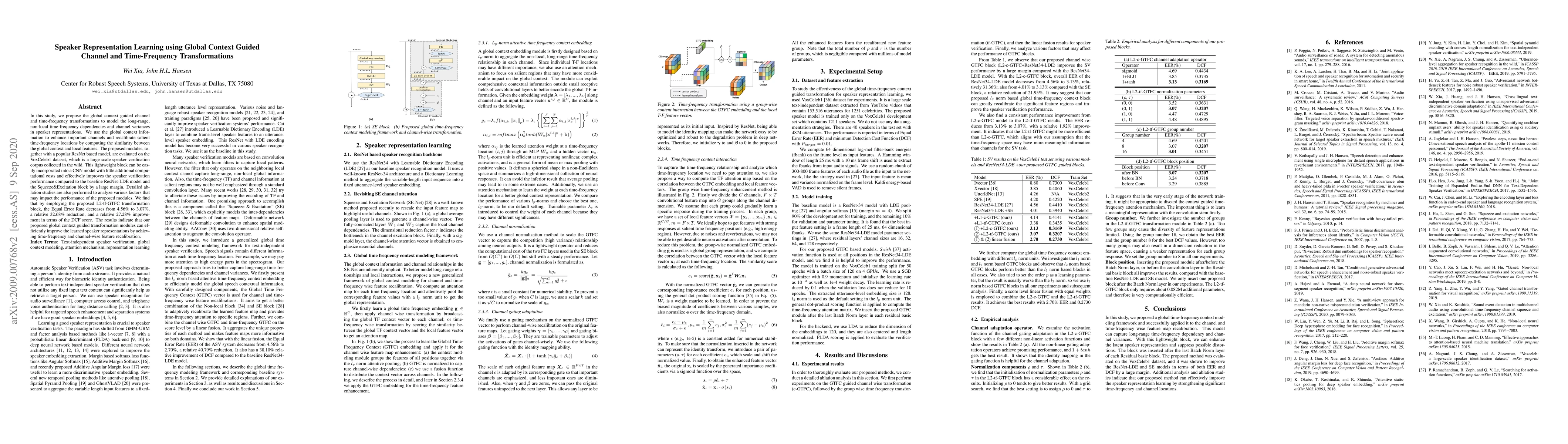 In this study, we propose the global context guided channel and time-frequency transformations to model the long-range, non-local time-frequency dependencies and channel variances in speaker representations. We use the global context information to enhance important channels and recalibrate salient time-frequency locations by computing the similarity between the global context and local features. The proposed modules, together with a popular ResNet based model, are evaluated on the VoxCeleb1 dataset, which is a large scale speaker verification corpus collected in the wild. This lightweight block can be easily incorporated into a CNN model with little additional computational costs and effectively improves the speaker verification performance compared to the baseline ResNet-LDE model and the Squeeze&Excitation block by a large margin. Detailed ablation studies are also performed to analyze various factors that may impact the performance of the proposed modules. We find that by employing the proposed L2-tf-GTFC transformation block, the Equal Error Rate decreases from 4.56% to 3.07%, a relative 32.68% reduction, and a relative 27.28% improvement in terms of the DCF score. The results indicate that our proposed global context guided transformation modules can efficiently improve the learned speaker representations by achieving time-frequency and channel-wise feature recalibration.