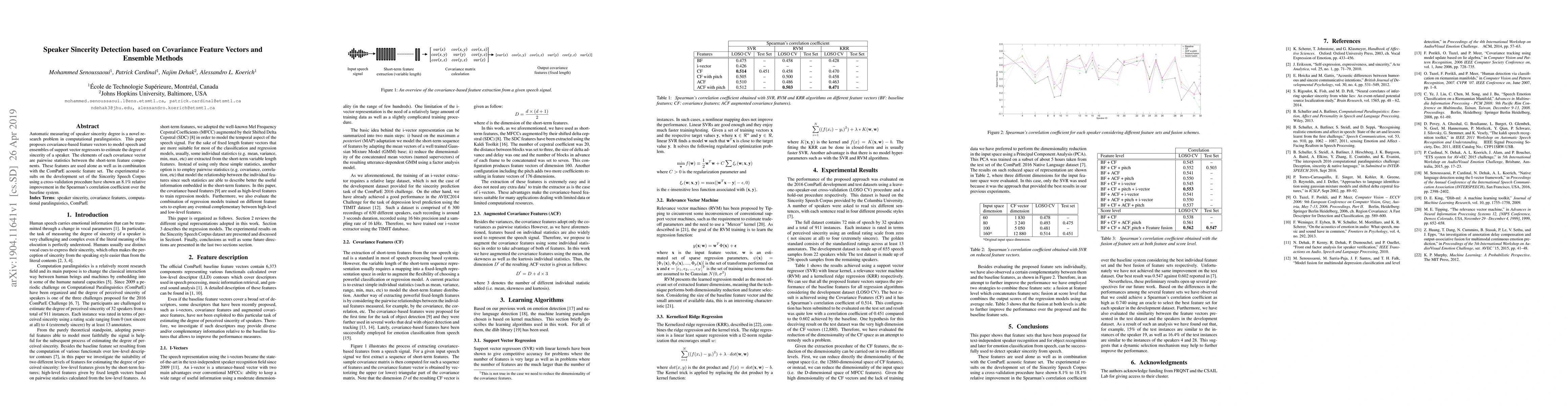 Automatic measuring of speaker sincerity degree is a novel research problem in computational paralinguistics. This paper proposes covariance-based feature vectors to model speech and ensembles of support vector regressors to estimate the degree of sincerity of a speaker. The elements of each covariance vector are pairwise statistics between the short-term feature components. These features are used alone as well as in combination with the ComParE acoustic feature set. The experimental results on the development set of the Sincerity Speech Corpus using a cross-validation procedure have shown an 8.1% relative improvement in the Spearman's correlation coefficient over the baseline system.