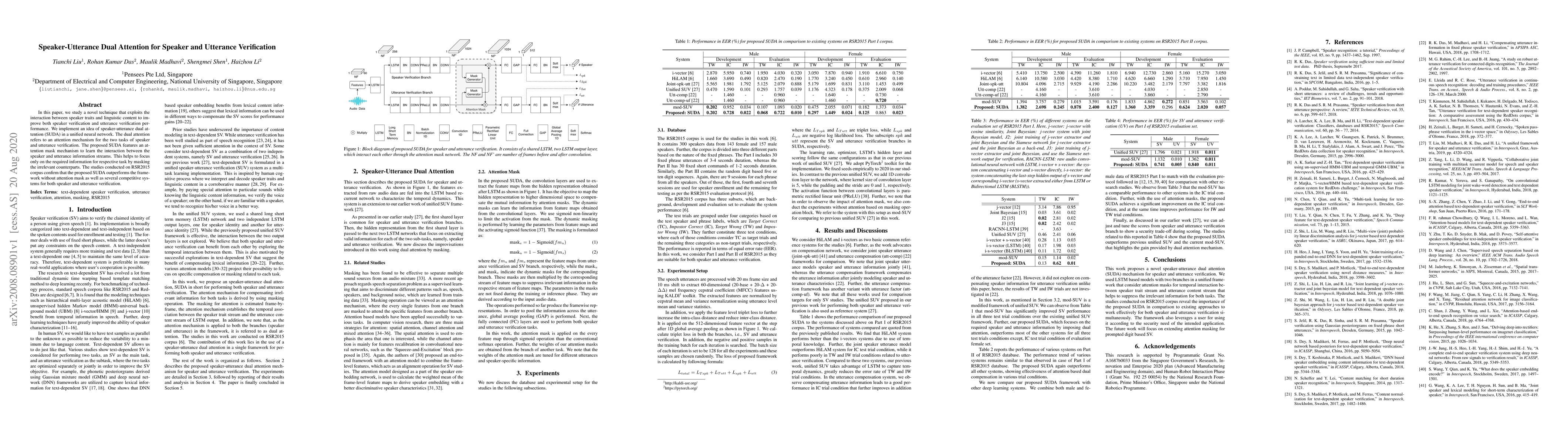 This paper introduces a speaker-utterance dual attention (SUDA) technique to enhance both speaker and utterance verification by leveraging the interaction between speaker traits and linguistic content. The SUDA mechanism, implemented in a neural network, uses an attention mask to focus on relevant information for each task, outperforming existing methods on the RSR2015 corpus.