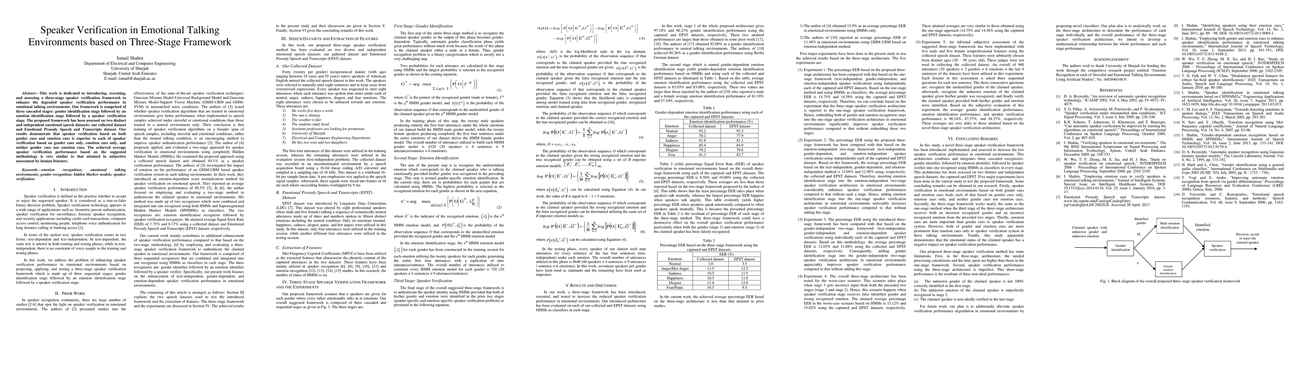 This paper proposes a three-stage speaker verification framework that enhances performance in emotional environments by incorporating gender and emotion identification before speaker verification. Results show superior performance compared to methods using only gender or emotion cues, with results closely matching human listener assessments.