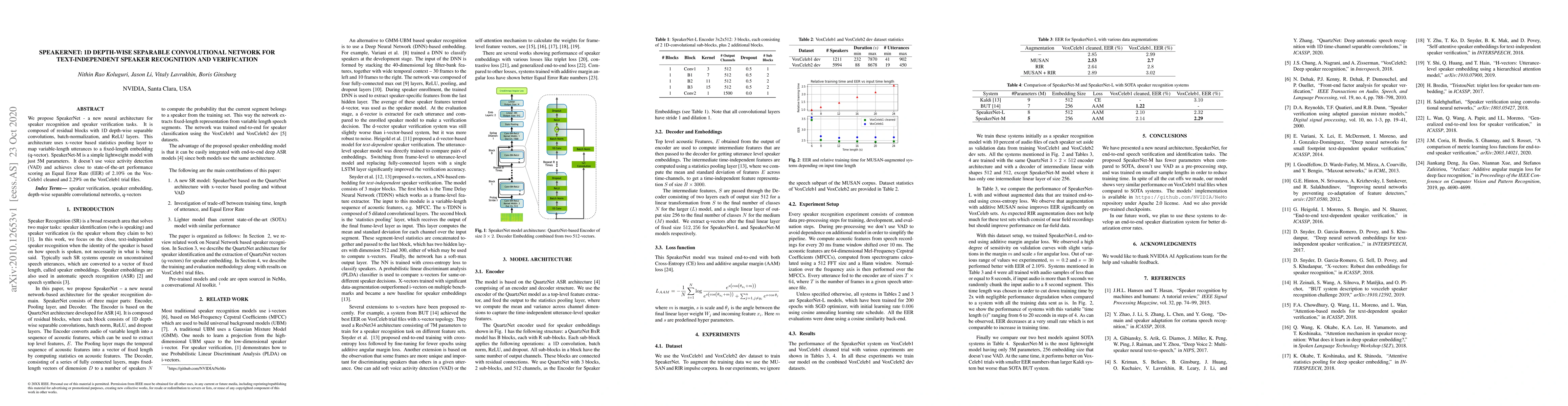 SpeakerNet is a novel neural architecture for text-independent speaker recognition and verification using 1D depth-wise separable convolutions. It achieves near-state-of-the-art performance with an EER of 2.10% on VoxCeleb1 cleaned and 2.29% on VoxCeleb1 trial files, without requiring voice activity detection.