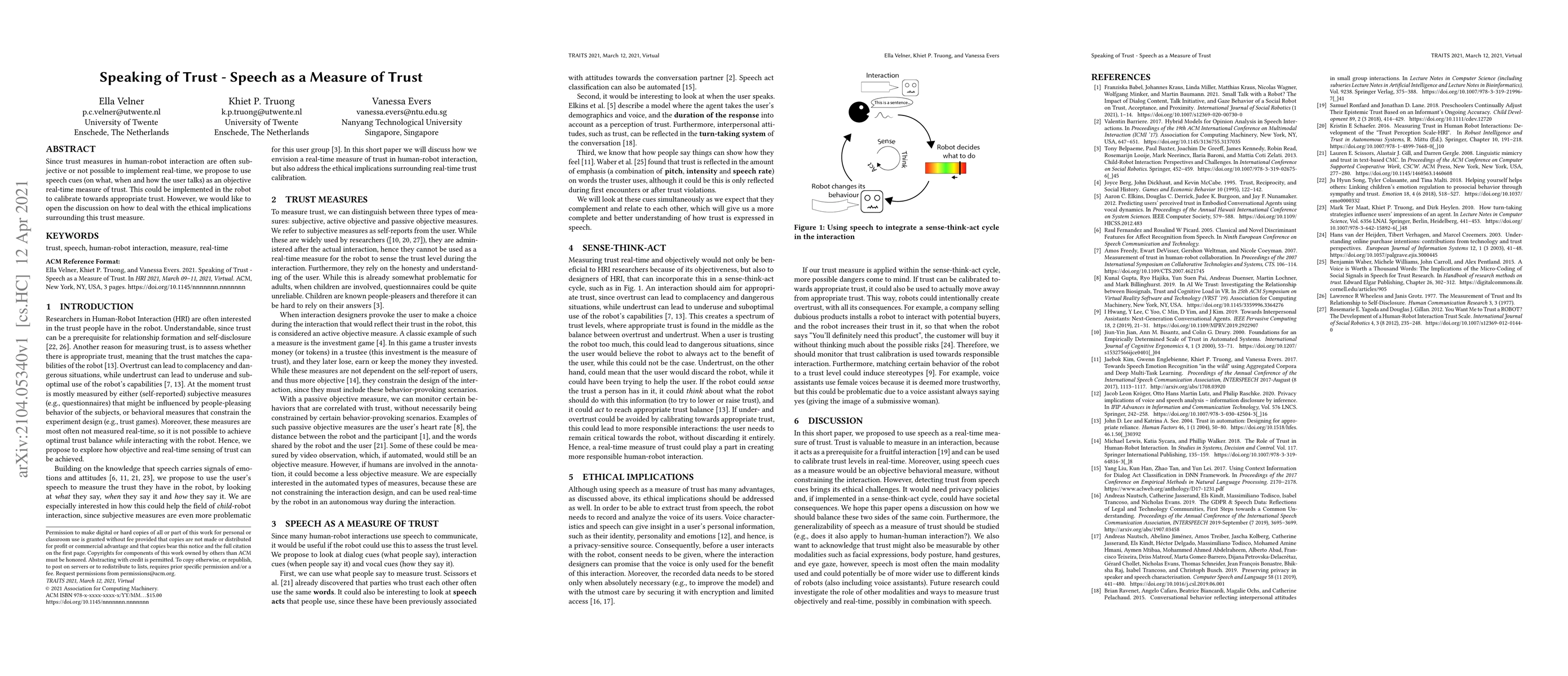 This paper proposes using speech cues as an objective real-time measure of trust in human-robot interactions, aiming to calibrate robots based on these cues. It also raises ethical considerations regarding the implementation of such trust measures.