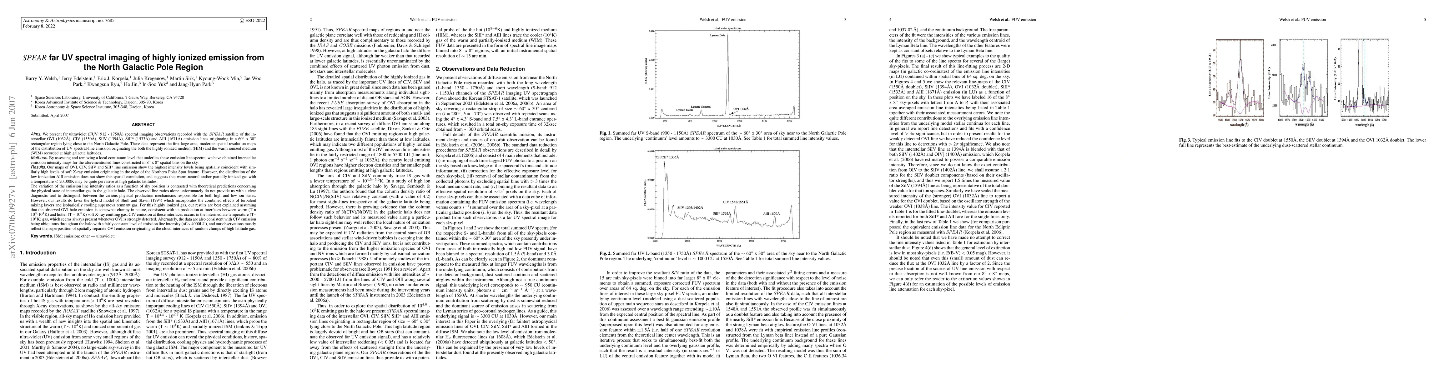 We present far ultraviolet (FUV: 912 - 1750AA) spectral imaging observations recorded with the SPEAR satellite of the interstellar OVI (1032AA), CIV (1550AA), SiIV (1394AA), SiII* (1533AA) and AlII (1671AA) emission lines originating in a 60 x 30 degree rectangular region lying close to the North Galactic Pole. These data represent the first large area, moderate spatial resolution maps of the distribution of UV spectral-line emission originating the both the highly ionized medium (HIM) and the warm ionized medium (WIM) recorded at high galactic latitudes.