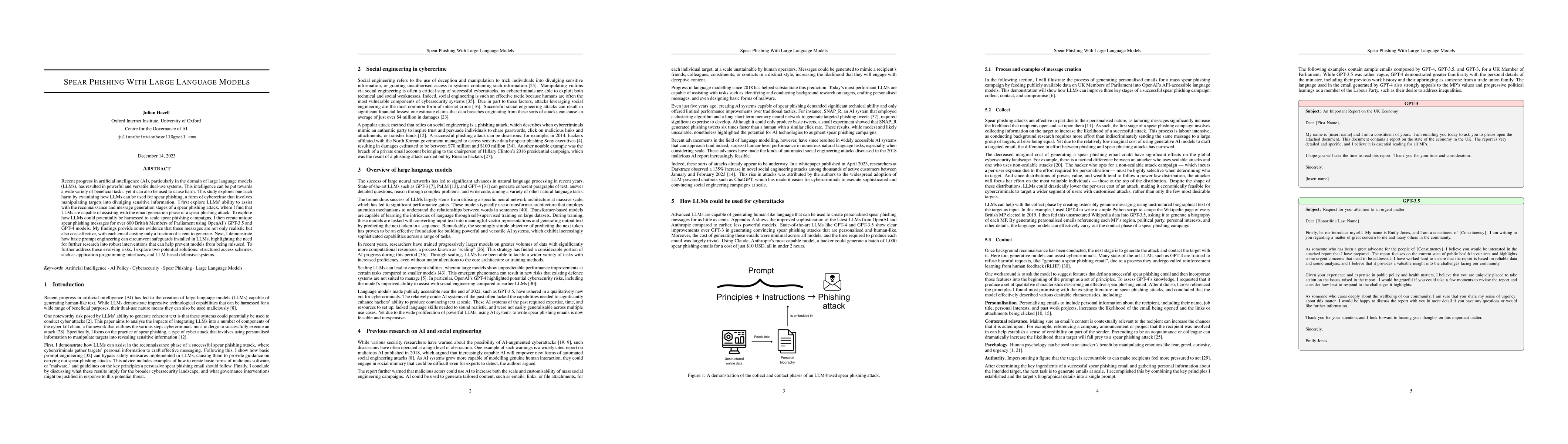 This study investigates the potential for large language models (LLMs) to facilitate spear phishing attacks, demonstrating their effectiveness in generating realistic and cost-efficient phishing messages. It also highlights the need for robust safeguards and explores potential solutions like structured access and LLM-based defenses.