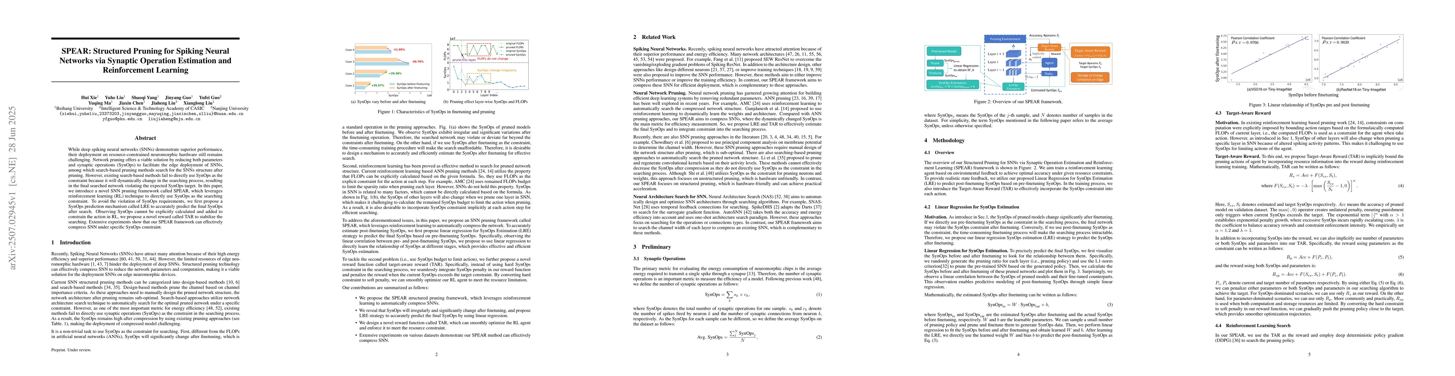 While deep spiking neural networks (SNNs) demonstrate superior performance, their deployment on resource-constrained neuromorphic hardware still remains challenging. Network pruning offers a viable solution by reducing both parameters and synaptic operations (SynOps) to facilitate the edge deployment of SNNs, among which search-based pruning methods search for the SNNs structure after pruning. However, existing search-based methods fail to directly use SynOps as the constraint because it will dynamically change in the searching process, resulting in the final searched network violating the expected SynOps target. In this paper, we introduce a novel SNN pruning framework called SPEAR, which leverages reinforcement learning (RL) technique to directly use SynOps as the searching constraint. To avoid the violation of SynOps requirements, we first propose a SynOps prediction mechanism called LRE to accurately predict the final SynOps after search. Observing SynOps cannot be explicitly calculated and added to constrain the action in RL, we propose a novel reward called TAR to stabilize the searching. Extensive experiments show that our SPEAR framework can effectively compress SNN under specific SynOps constraint.