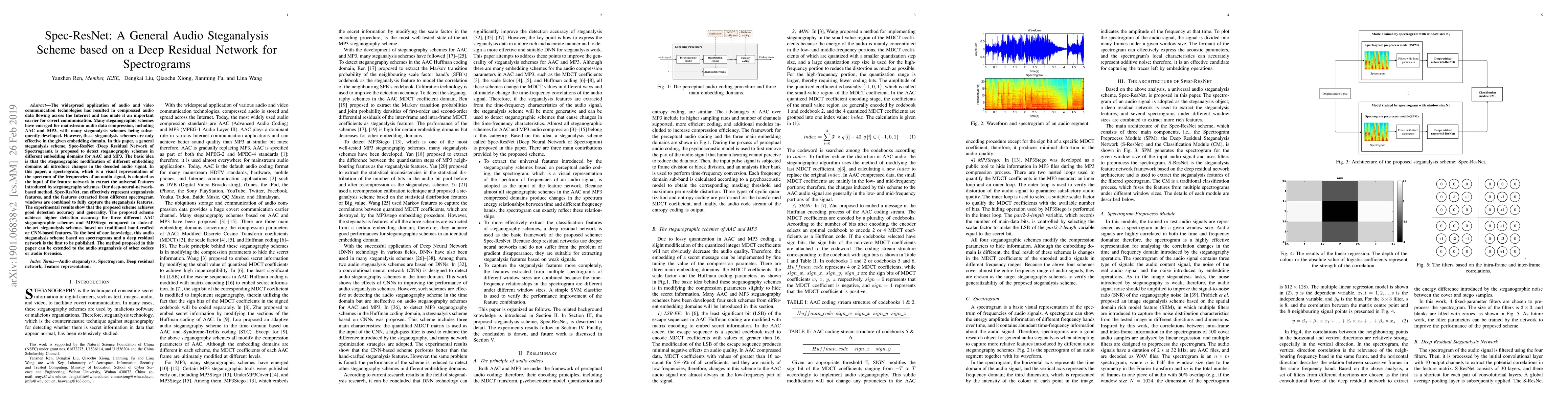 The paper proposes Spec-ResNet, a general steganalysis scheme based on a deep residual network of spectrogram to detect steganography across different audio codecs like AAC and MP3. The method extracts universal features from spectrograms and demonstrates superior detection accuracy compared to traditional and CNN-based steganalysis techniques.