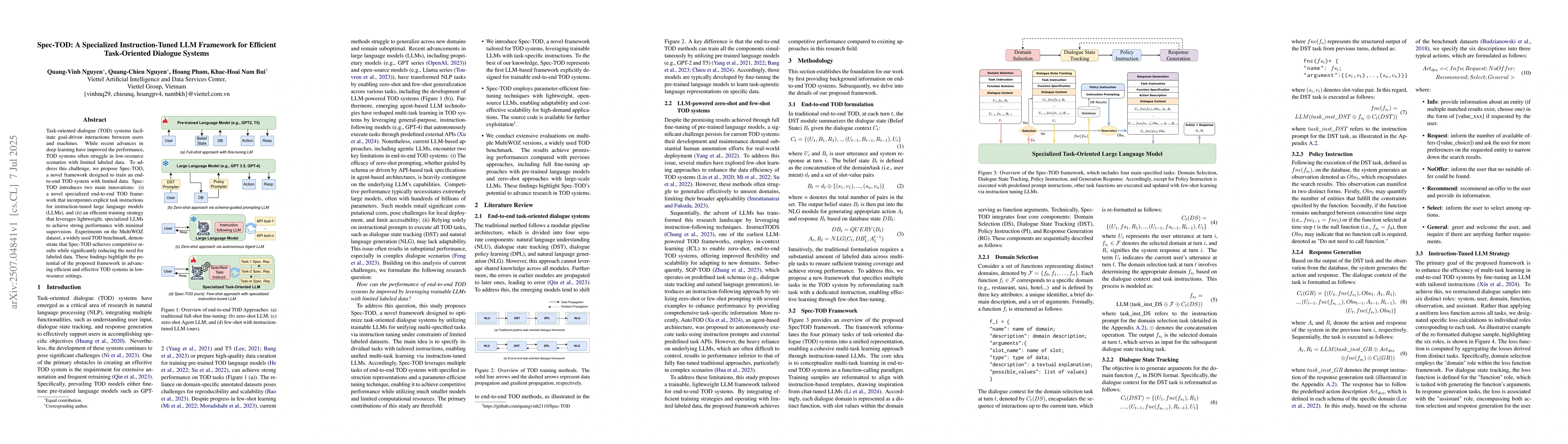 Task-oriented dialogue (TOD) systems facilitate goal-driven interactions between users and machines. While recent advances in deep learning have improved the performance, TOD systems often struggle in low-resource scenarios with limited labeled data. To address this challenge, we propose Spec-TOD, a novel framework designed to train an end-to-end TOD system with limited data. Spec-TOD introduces two main innovations: (i) a novel specialized end-to-end TOD framework that incorporates explicit task instructions for instruction-tuned large language models (LLMs), and (ii) an efficient training strategy that leverages lightweight, specialized LLMs to achieve strong performance with minimal supervision. Experiments on the MultiWOZ dataset, a widely used TOD benchmark, demonstrate that Spec-TOD achieves competitive results while significantly reducing the need for labeled data. These findings highlight the potential of the proposed framework in advancing efficient and effective TOD systems in low-resource settings.