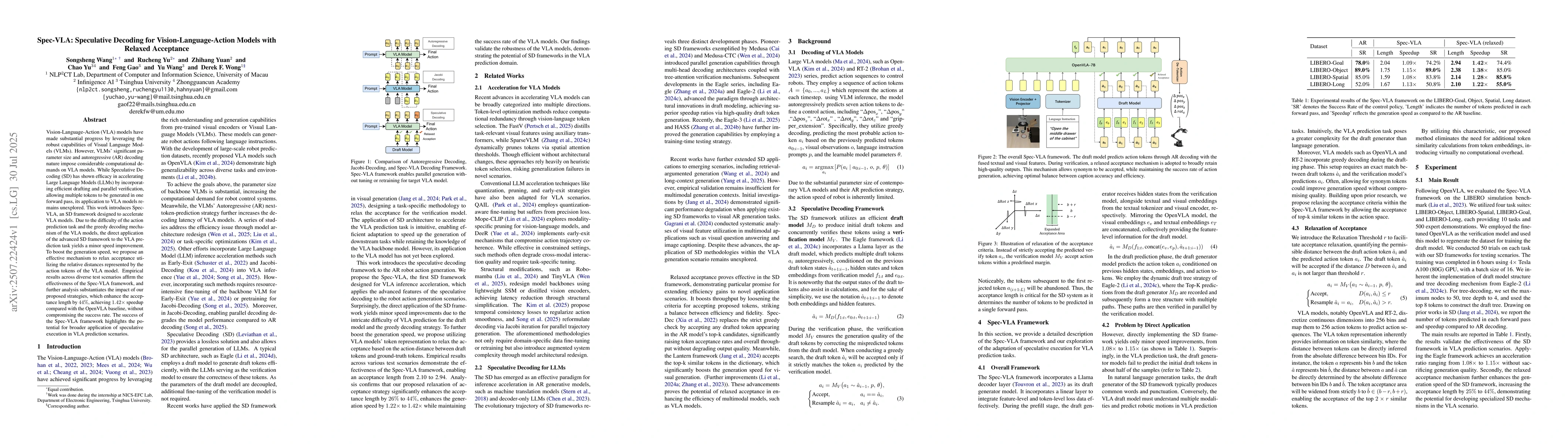 The research is novel in applying speculative decoding to VLA prediction tasks, introducing a relaxed acceptance strategy tailored to the unique challenges of VLA models, and demonstrating its effectiveness through empirical results.