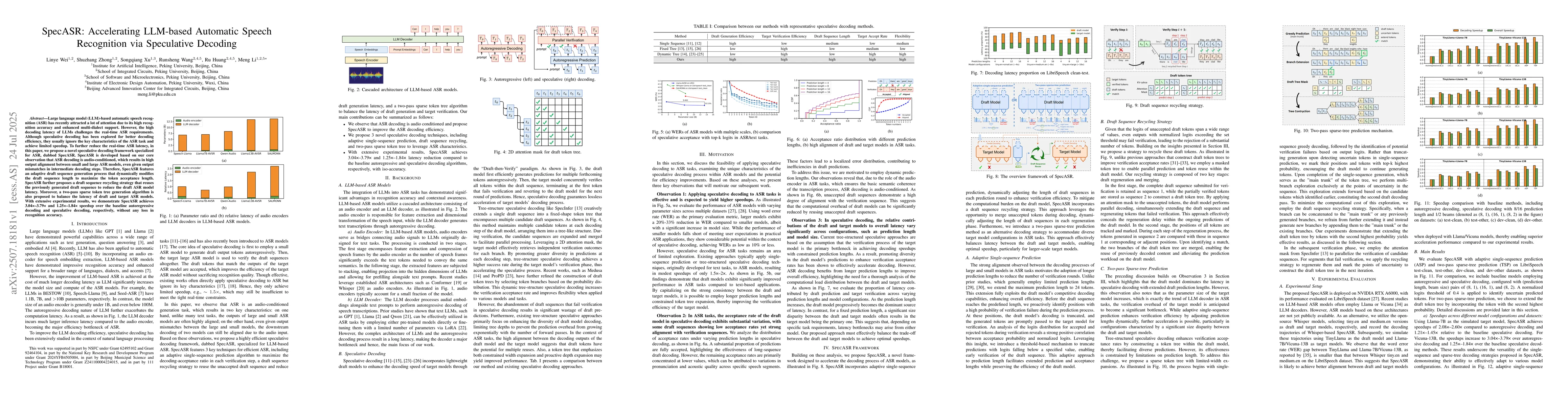 Large language model (LLM)-based automatic speech recognition (ASR) has recently attracted a lot of attention due to its high recognition accuracy and enhanced multi-dialect support. However, the high decoding latency of LLMs challenges the real-time ASR requirements. Although speculative decoding has been explored for better decoding efficiency, they usually ignore the key characteristics of the ASR task and achieve limited speedup. To further reduce the real-time ASR latency, in this paper, we propose a novel speculative decoding framework specialized for ASR, dubbed SpecASR. SpecASR is developed based on our core observation that ASR decoding is audio-conditioned, which results in high output alignment between small and large ASR models, even given output mismatches in intermediate decoding steps. Therefore, SpecASR features an adaptive draft sequence generation process that dynamically modifies the draft sequence length to maximize the token acceptance length. SpecASR further proposes a draft sequence recycling strategy that reuses the previously generated draft sequence to reduce the draft ASR model latency. Moreover, a two-pass sparse token tree generation algorithm is also proposed to balance the latency of draft and target ASR models. With extensive experimental results, we demonstrate SpecASR achieves 3.04x-3.79x and 1.25x-1.84x speedup over the baseline autoregressive decoding and speculative decoding, respectively, without any loss in recognition accuracy.