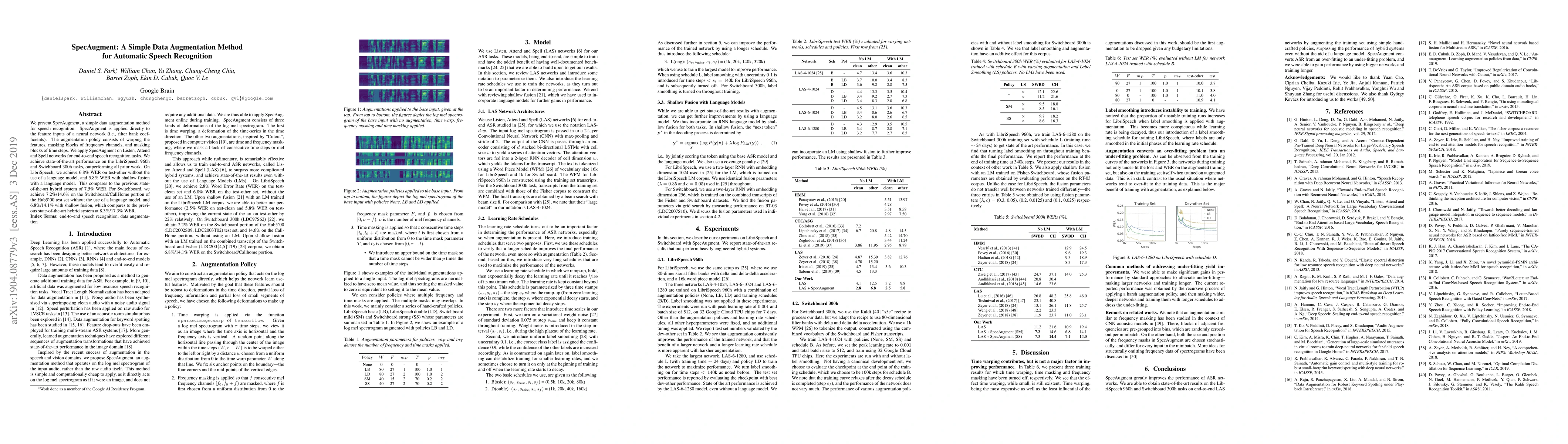 SpecAugment, a simple data augmentation method for speech recognition, achieves state-of-the-art performance on LibriSpeech and Switchboard tasks, outperforming prior work with 6.8% WER on test-other without language model.