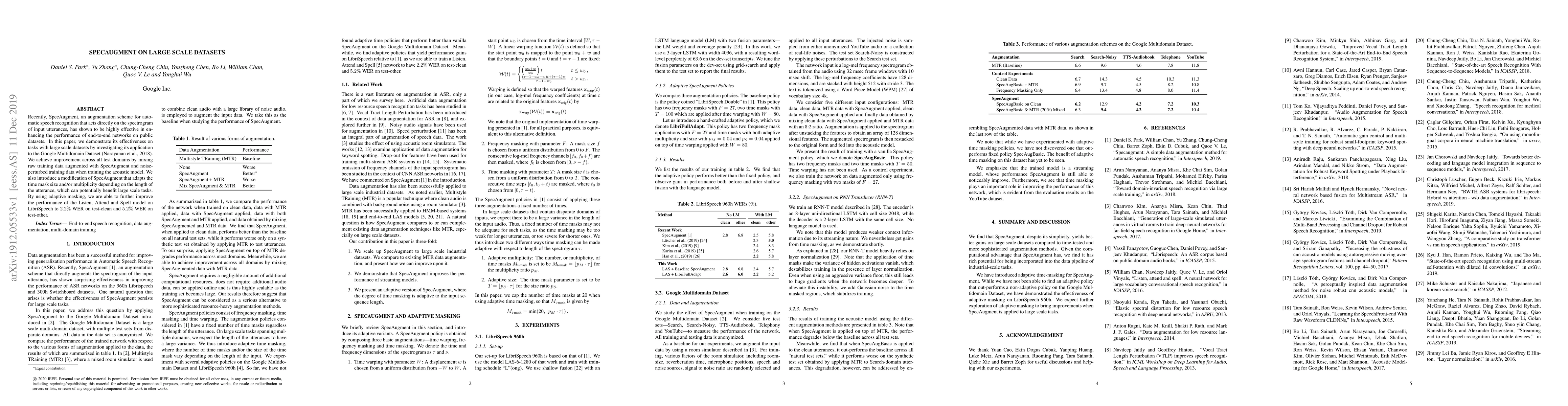 This paper shows that SpecAugment, a speech recognition technique, improves performance on large-scale datasets by mixing augmented data with noise-perturbed training data. The authors also introduce an adaptive version of SpecAugment that adjusts mask size based on utterance length, leading to further improvements in speech recognition tasks.