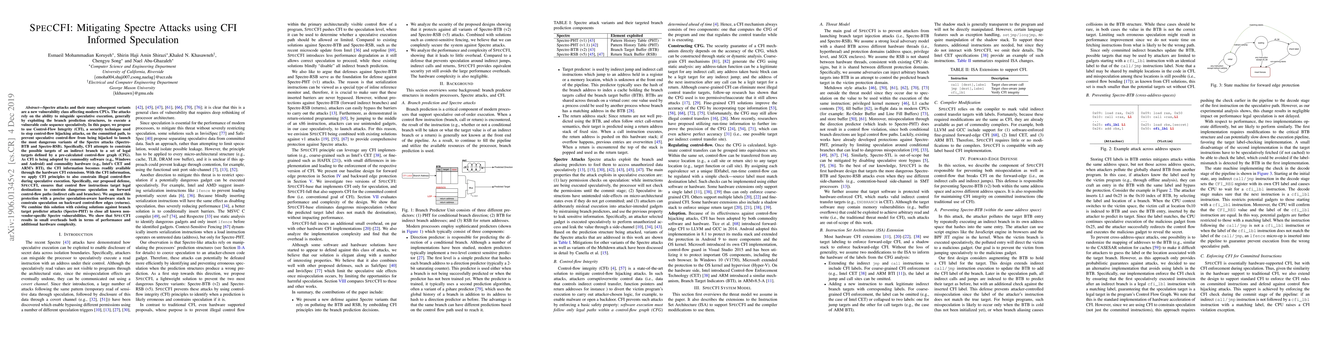 This paper proposes SPECCFI, a defense mechanism that leverages Control-Flow Integrity (CFI) to mitigate Spectre attacks by constraining speculative execution to legal control-flow paths, using hardware CFI extensions. The solution combines CFI principles with a speculation-aware hardware stack and existing defenses to address all known Spectre variants with minimal performance and hardware overhead.