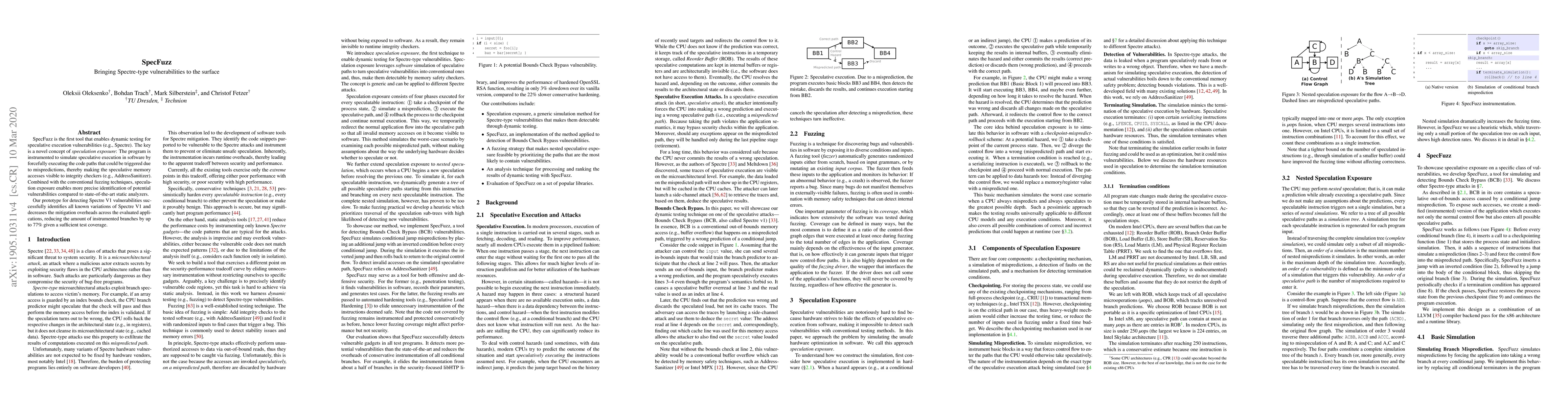 SpecFuzz dynamically tests for speculative execution vulnerabilities like Spectre by simulating speculative execution paths, making memory accesses visible to integrity checkers. It combines speculation exposure with fuzzing to identify vulnerabilities more precisely than static analyzers, successfully detecting all known Spectre V1 variations while reducing instrumented branches by up to 77%.