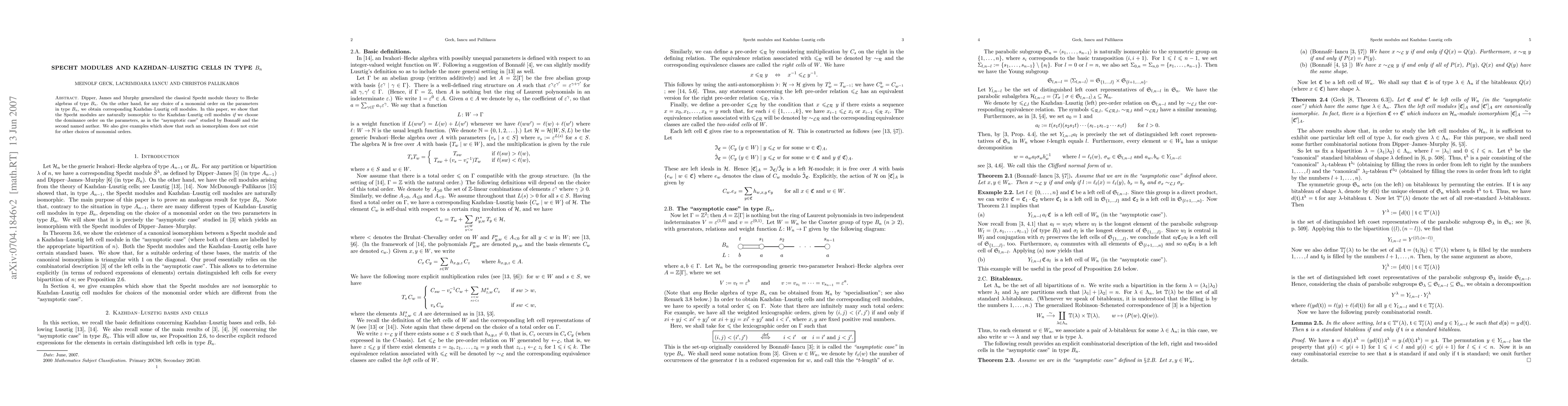 Dipper, James and Murphy generalized the classical Specht module theory to Hecke algebras of type $B_n$. On the other hand, for any choice of a monomial order on the parameters in type $B_n$, we obtain corresponding Kazhdan--Lusztig cell modules. In this paper, we show that the Specht modules are naturally equivalent to the Kazhdan--Lusztig cell modules {\em if} we choose the dominance order on the parameters, as in the ``asymptotic case'' studied by Bonnaf\'e and the second named author. We also give examples which show that such an equivalence does not hold for other choices of monomial orders.