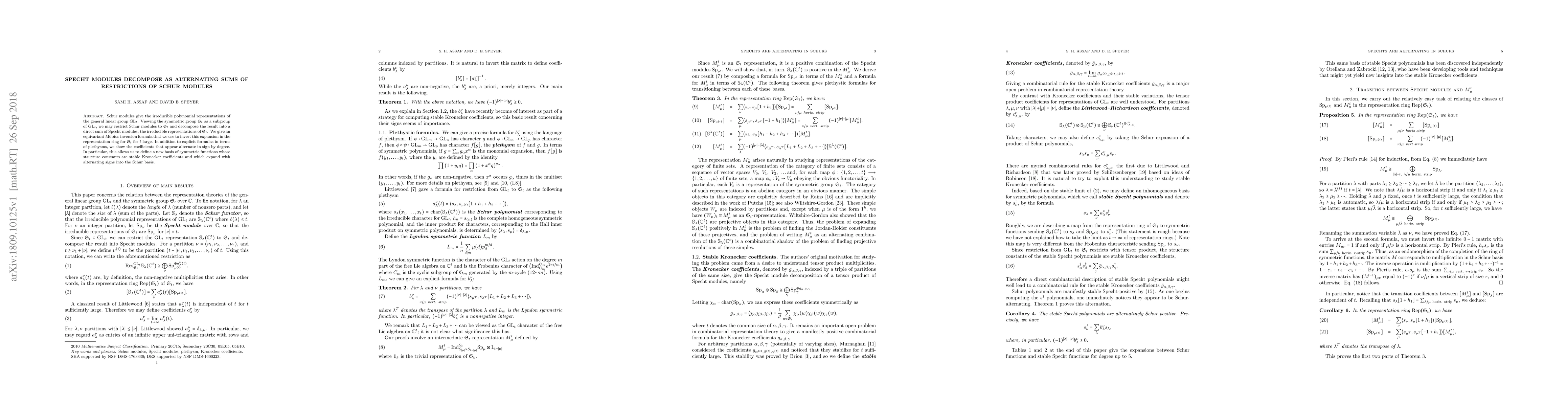 Researchers show that Specht modules can be decomposed into alternating sums of restrictions of Schur modules for large t, providing a new basis of symmetric functions with stable Kronecker coefficients.