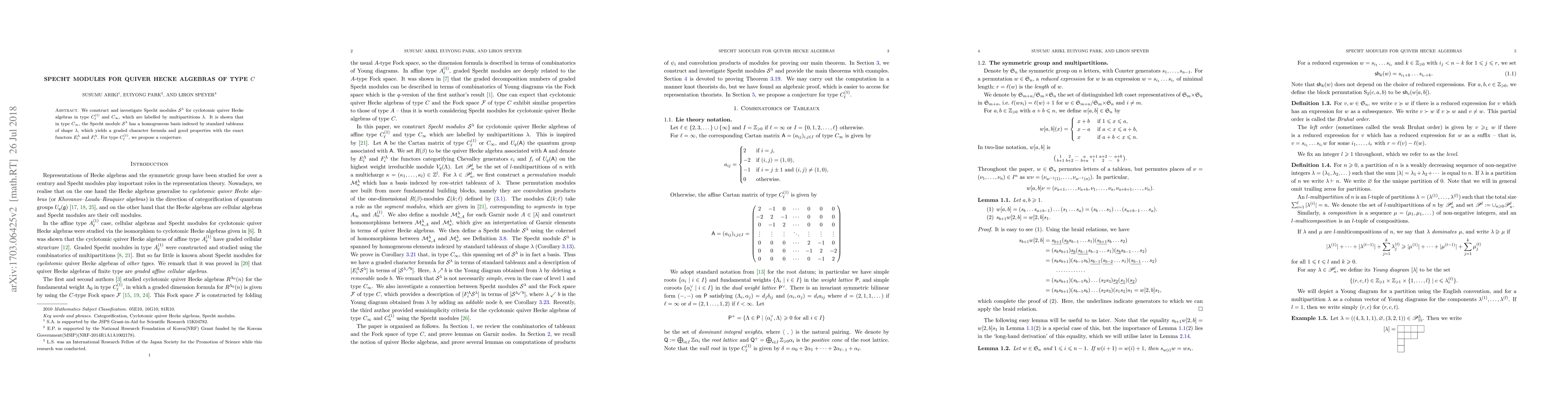 The paper introduces a method for constructing and analyzing Specht modules for quiver Hecke algebras of type $C$, providing a graded character formula and good functorial properties in type $C_\infty$.