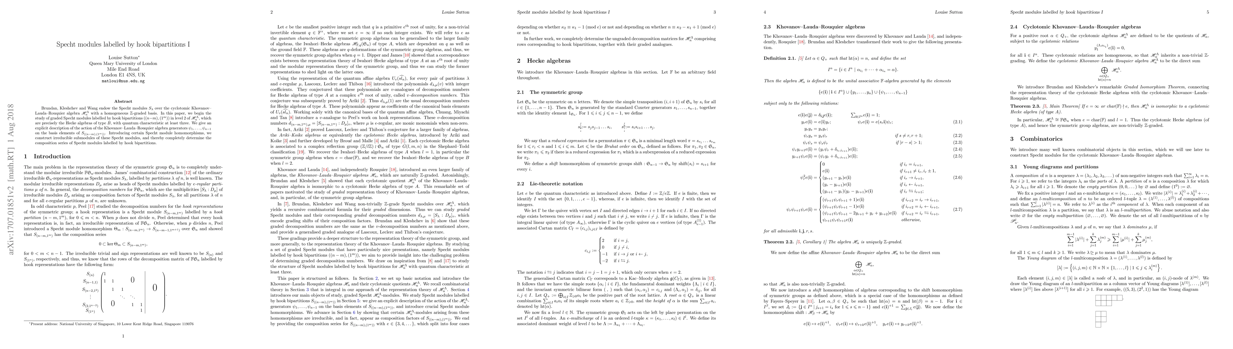 Brundan, Kleshchev and Wang equip the Specht modules $S_{\lambda}$ over the cyclotomic Khovanov--Lauda--Rouquier algebra $\mathscr{H}_n^{\Lambda}$ with a homogeneous $\mathbb{Z}$-graded basis. In this paper we begin the study of graded Specht modules labelled by hook bipartitions $((n-m),(1^m))$ in level $2$ of $\mathscr{H}_n^{\Lambda}$, which are precisely the Hecke algebras of type B, with quantum characteristic at least three. We give an explicit description of the action of the Khovanov--Lauda--Rouquier algebra generators $\psi_1,\dots,\psi_{n-1}$ on the basis elements of $S_{((n-m),(1^m))}$. Introducing certain Specht module homomorphisms, we construct irreducible submodules of these Specht modules, and thereby completely determining the composition series of Specht modules labelled by hook bipartitions for $e\geqslant{3}$.