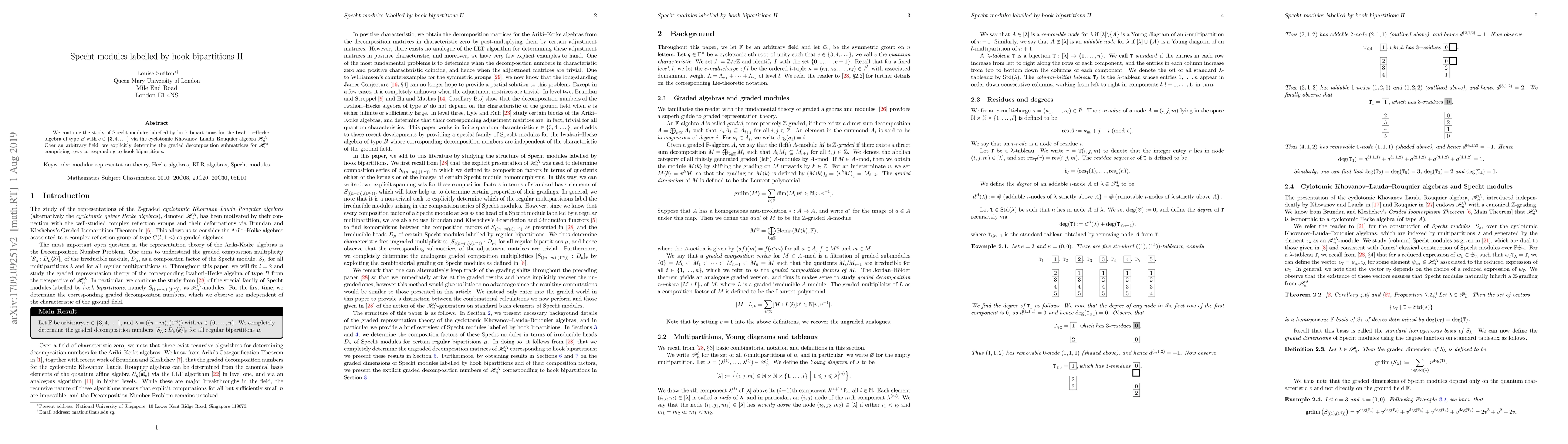 We continue the study of Specht modules labelled by hook bipartitions for the Iwahori--Hecke algebra of type $B$ with $e\in\{3,4,\dots\}$ via the cyclotomic Khovanov--Lauda--Rouquier algebra $\mathscr{H}_n^{\Lambda}$. Over an arbitrary field, we explicitly determine the graded decomposition submatrices for $\mathscr{H}_n^{\Lambda}$ comprising rows corresponding to hook bipartitions.