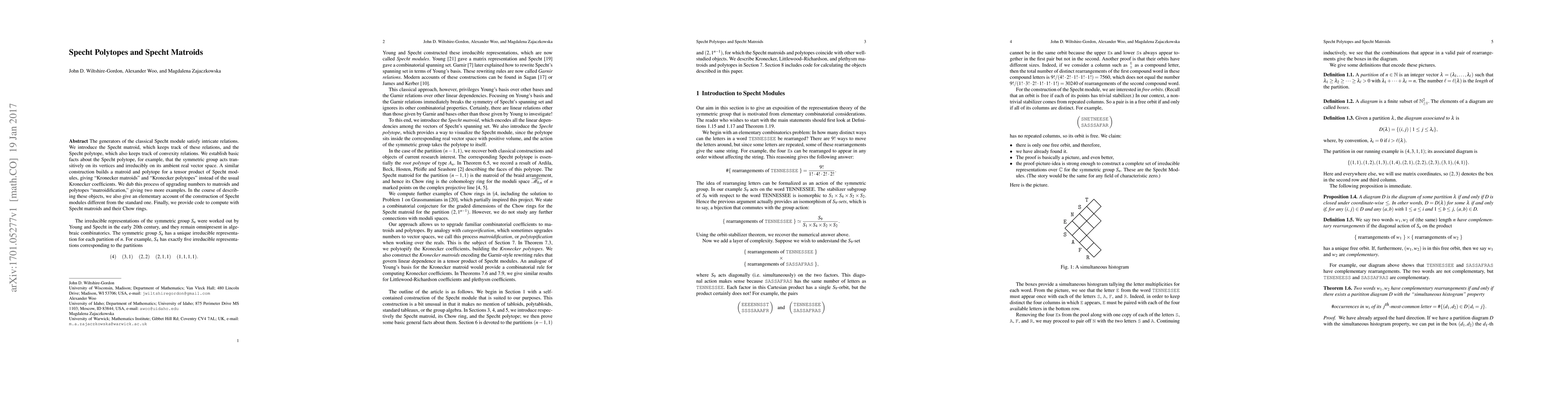 The generators of the classical Specht module satisfy intricate relations. We introduce the Specht matroid, which keeps track of these relations, and the Specht polytope, which also keeps track of convexity relations. We establish basic facts about the Specht polytope, for example, that the symmetric group acts transitively on its vertices and irreducibly on its ambient real vector space. A similar construction builds a matroid and polytope for a tensor product of Specht modules, giving "Kronecker matroids" and "Kronecker polytopes" instead of the usual Kronecker coefficients. We dub this process of upgrading numbers to matroids and polytopes "matroidification," giving two more examples. In the course of describing these objects, we also give an elementary account of the construction of Specht modules different from the standard one. Finally, we provide code to compute with Specht matroids and their Chow rings.