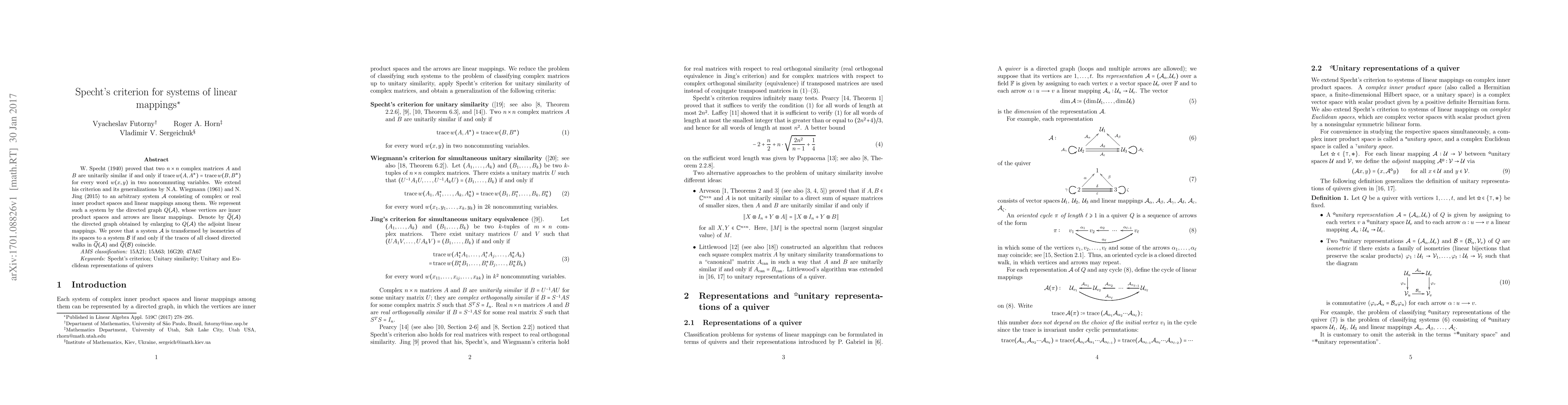 A research paper extends Specht's criterion to an arbitrary system of linear mappings among complex or real inner product spaces, proving that such systems are unitarily similar if their trace values for closed directed walks coincide.