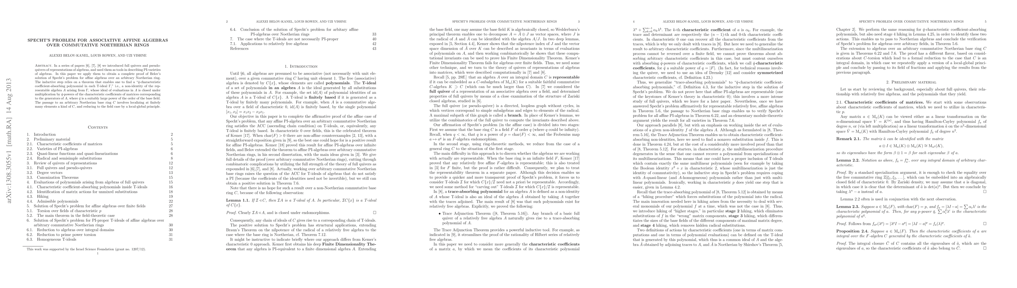 In a series of papers \cite{BRV1}, \cite{BRV2}, \cite{BRV3} we introduced full quivers and pseudo-quivers of representations of algebras, and used them as tools in describing PI-varieties of algebras. In this paper we apply them to obtain a complete proof of Belov's solution of Specht's problem for affine algebras over an arbitrary Noetherian ring. The inductive step relies on a theorem that enables one to find a "$\bar q$-characteristic coefficient-absorbing polynomial in each T-ideal $\Gamma$," i.e., a non-identity of the representable algebra $A$ arising from $\Gamma$, whose ideal of evaluations in $A$ is closed under multiplication by $\bar q$-powers of the characteristic coefficients of matrices corresponding to the generators of $A$, where $\bar q$ is a suitably large power of the order of the base field. The passage to an arbitrary Noetherian base ring $C$ involves localizing at finitely many elements a kind of $C$, and reducing to the field case by a local-global principle.