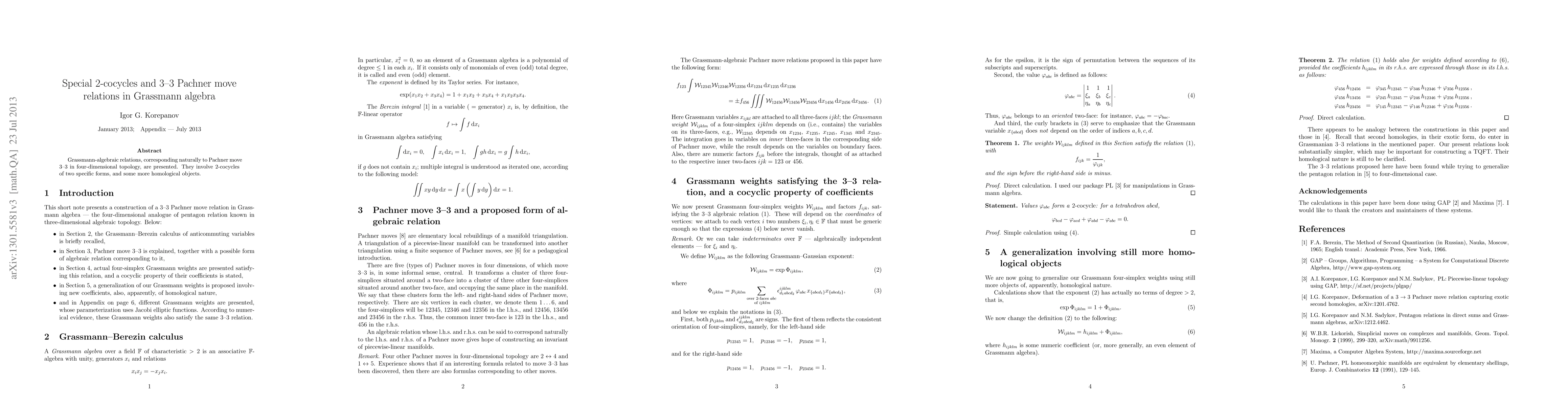 Summary: This paper explores Grassmann-algebraic relations associated with the 3--3 Pachner move in four-dimensional topology, focusing on special 2-cocycles and related homological structures. The findings offer insights into algebraic representations of topological transformations.