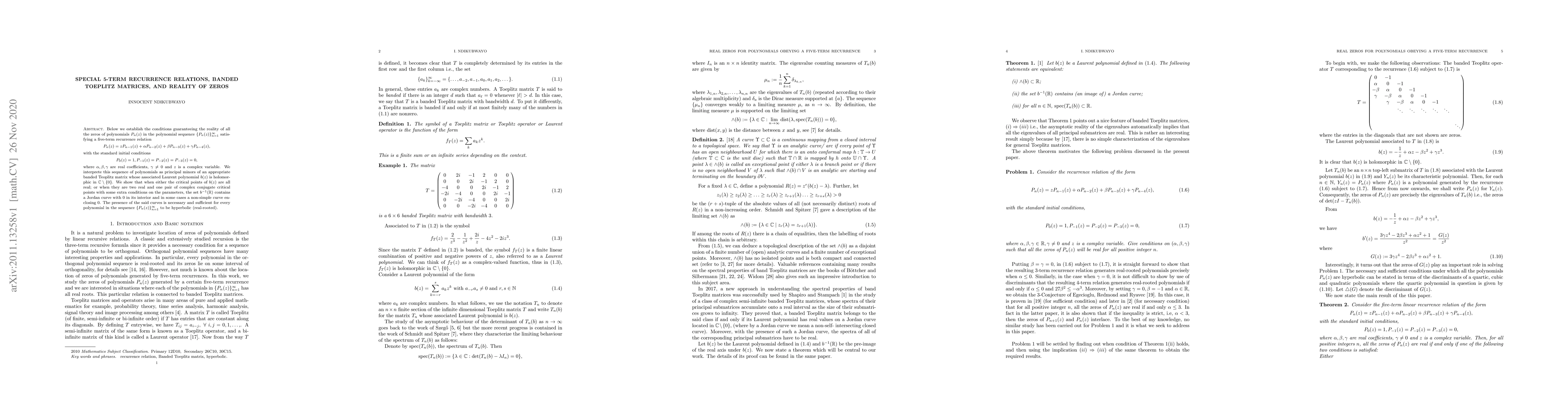 Below we establish the conditions guaranteeing the reality of all the zeros of polynomials $P_n(z)$ in the polynomial sequence $\{P_n(z)\}_{n=1}^{\infty}$ satisfying a five-term recurrence relation $$P_{n}(z)= zP_{n-1}(z) + \alpha P_{n-2}(z)+\beta P_{n-3}(z)+\gamma P_{n-4}(z),$$ with the standard initial conditions $$P_0(z) = 1, P_{-1}(z) = P_{-2}(z) =P_{-3}(z) = 0,$$ where $\alpha, \beta, \gamma$ are real coefficients, $\gamma\neq 0$ and $z$ is a complex variable. We interprete this sequence of polynomials as principal minors of an appropriate banded Teoplitz matrix whose associated Laurent polynomial $b(z)$ is holomorphic in $\mathbb{C}\setminus \{0\}$. We show that when either the critical points of $b(z)$ are all real; or when they are two real and one pair of complex conjugate critical points with some extra conditions on the parameters, the set $b^{-1}(\mathbb{R})$ contains a Jordan curve with $0$ in its interior and in some cases a non-simple curve enclosing $0$. The presence of the said curves is necessary and sufficient for every polynomial in the sequence $\{P_n(z)\}_{n=1}^{\infty}$ to be hyperbolic (real-rooted).