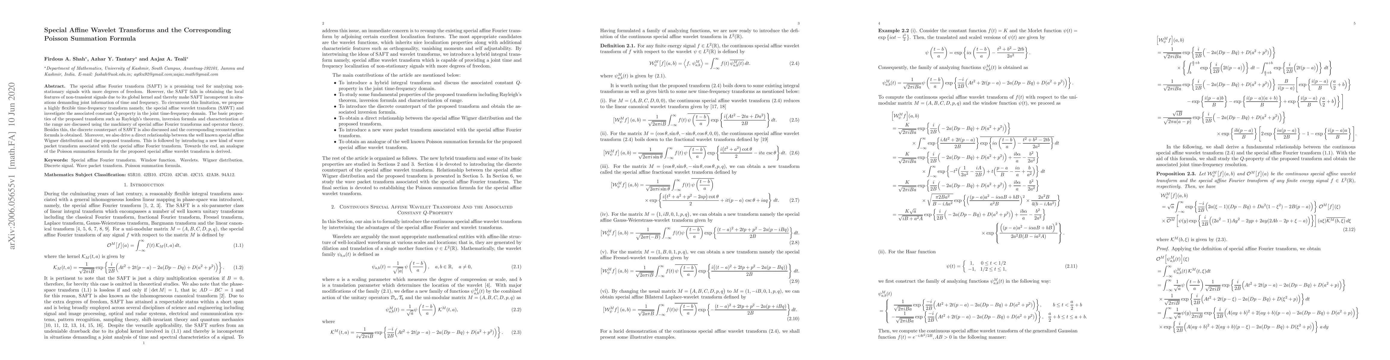 This paper proposes the special affine wavelet transform (SAWT) to analyze non-stationary signals, addressing the limitations of the special affine Fourier transform (SAFT) by providing local time-frequency information. It also derives an analogue of the Poisson summation formula for SAWT and discusses its properties and discrete counterpart.
