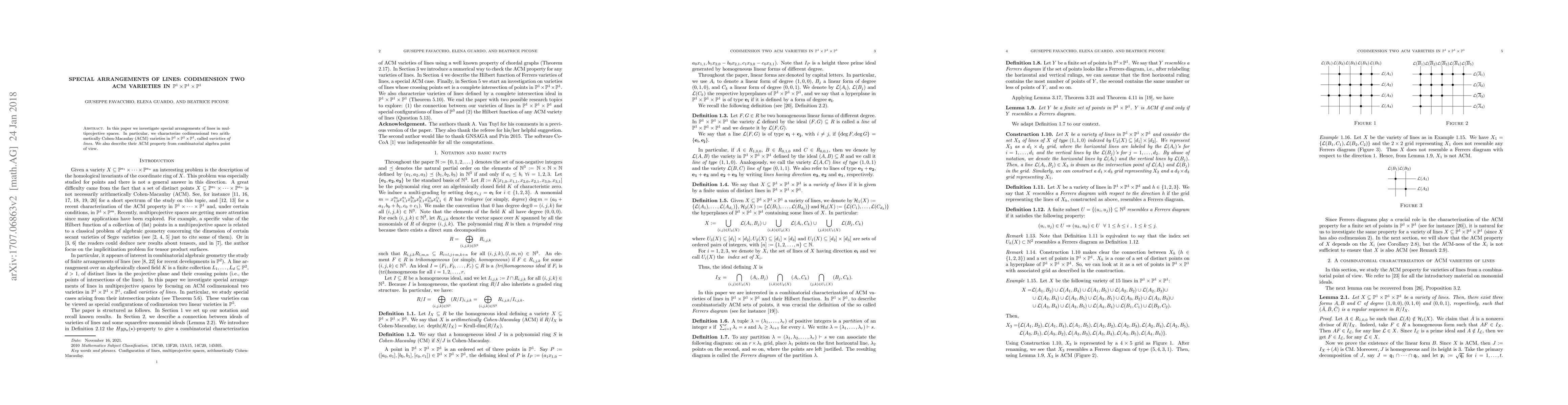 This paper studies special arrangements of lines in $\mathbb P^1\times\mathbb P^1\times\mathbb P^1$ and characterizes codimensional two arithmetically Cohen-Macaulay (ACM) varieties, known as varieties of lines, along with their ACM properties from a combinatorial algebra perspective.