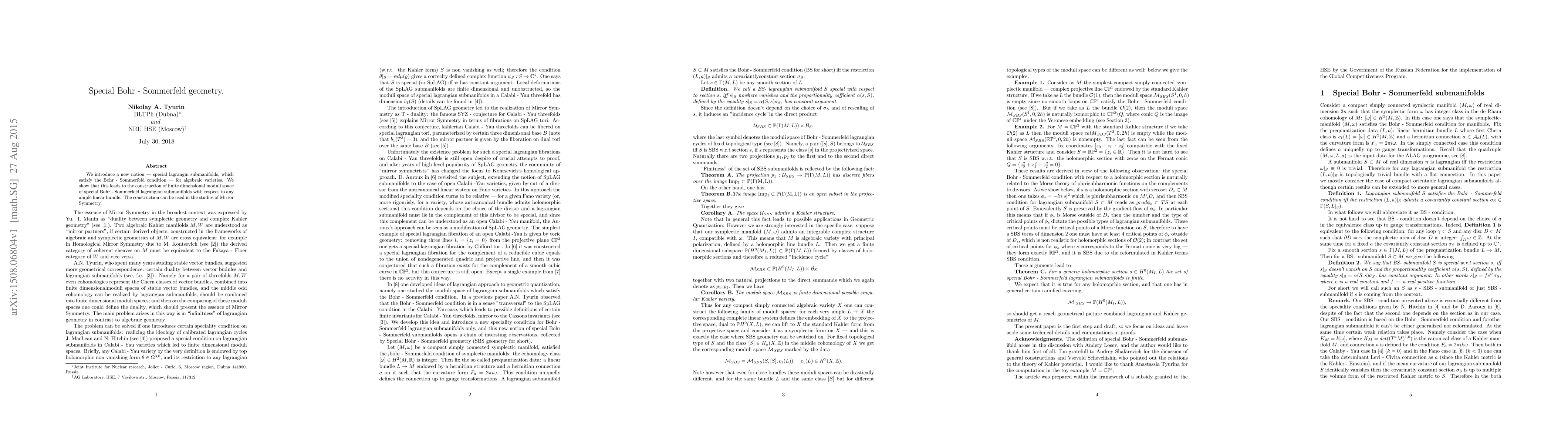 This paper introduces a novel method for special Lagrangian geometry applicable to Bohr-Sommerfeld Lagrangian submanifolds in symplectic manifolds, resulting in the construction of finite-dimensional moduli spaces for SBS Lagrangian cycles over algebraic varieties.
