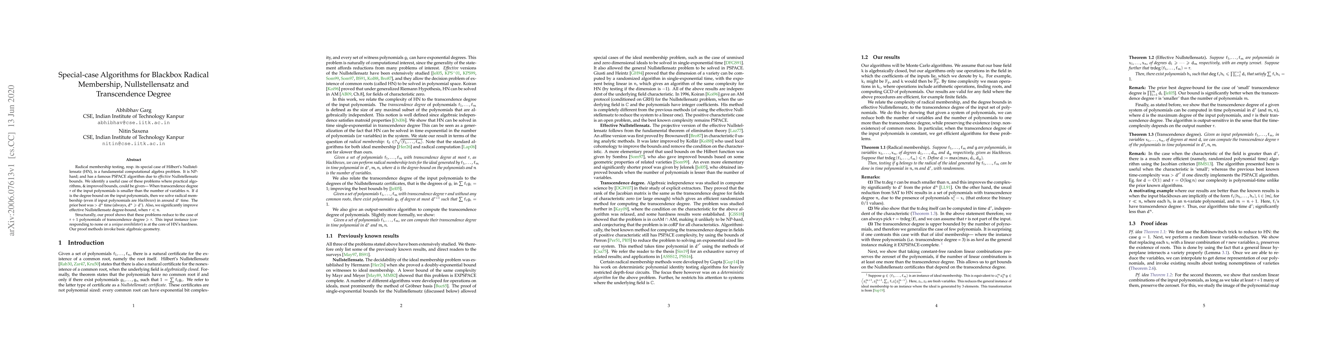 Researchers have developed special-case algorithms to solve radical membership testing and Hilbert's Nullstellensatz problems in polynomial time when the transcendence degree is small compared to the number of variables.